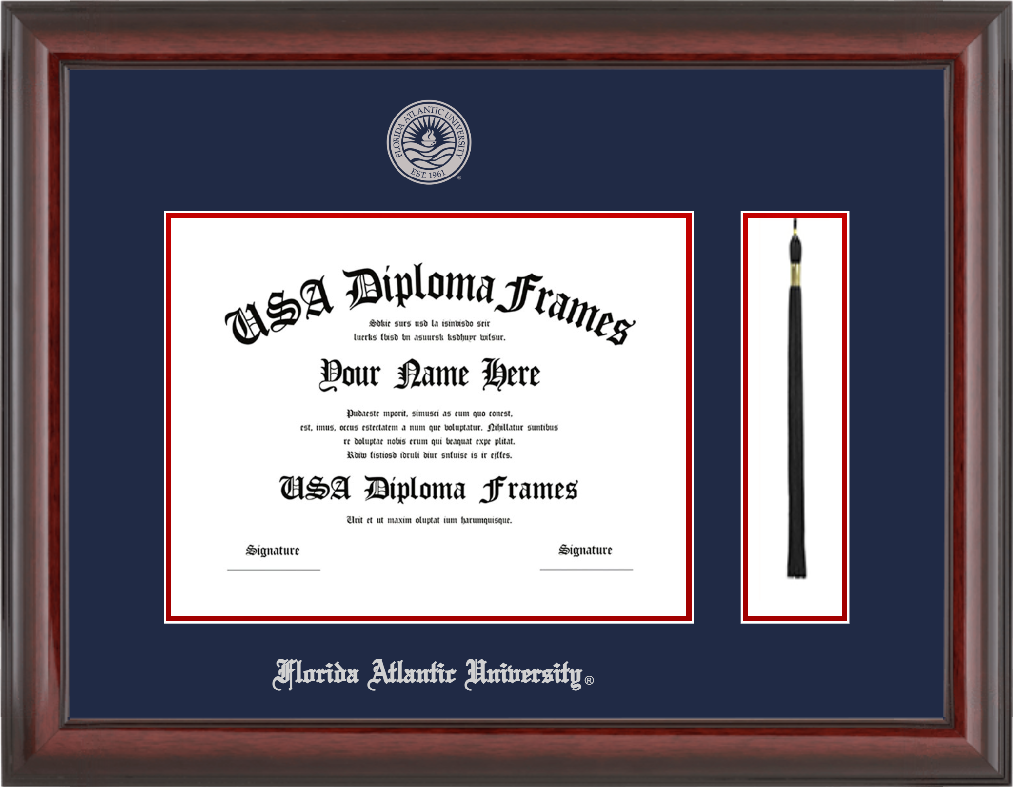 Florida Atlantic University Diploma Frame with Tassel – Cherry Mahogany Glossy – Navy and Red Mat – Silver Seal
