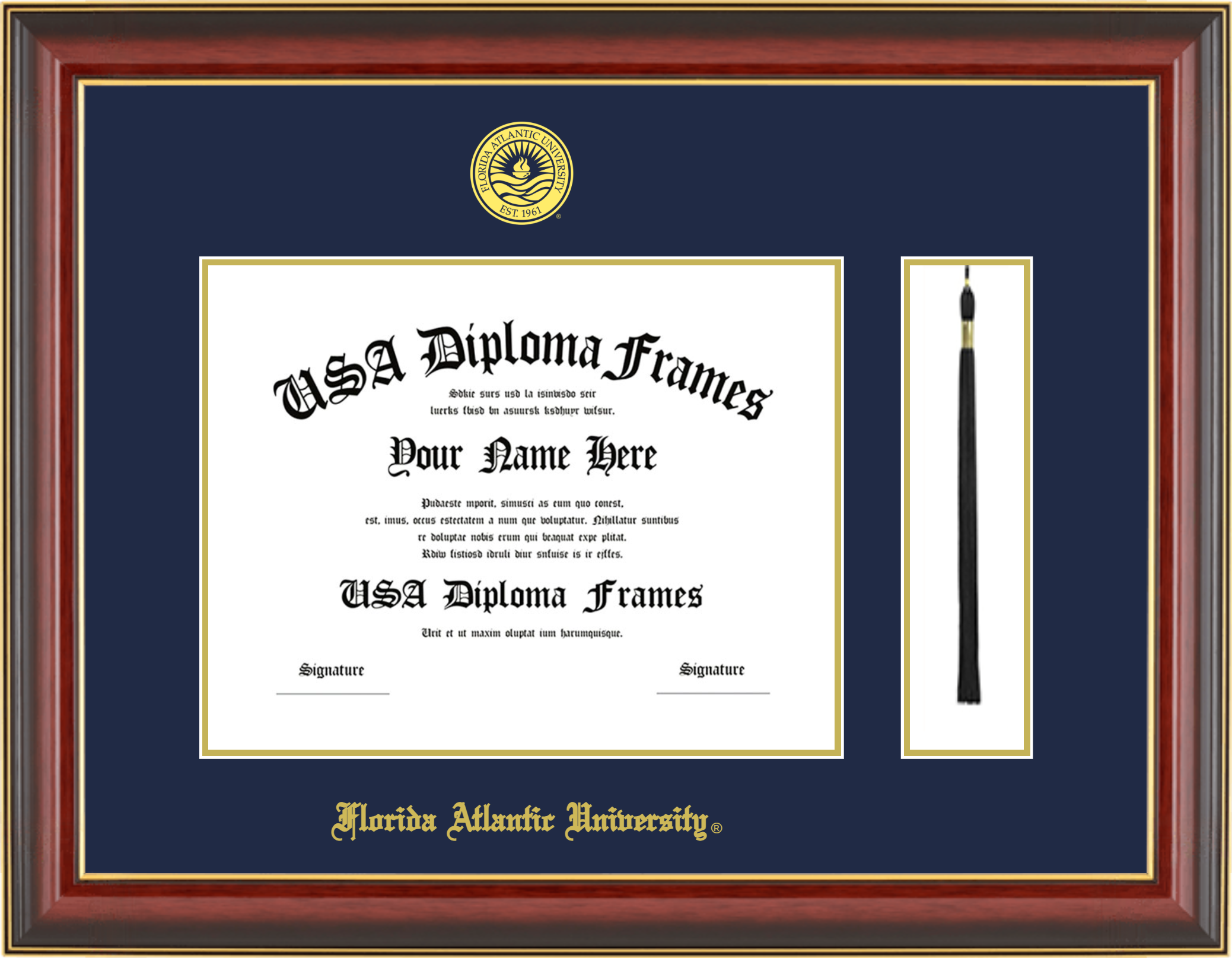 Florida Atlantic University Diploma Frame with Tassel – Cherry Mahogany Gold Trim Glossy – Navy and Gold Mat