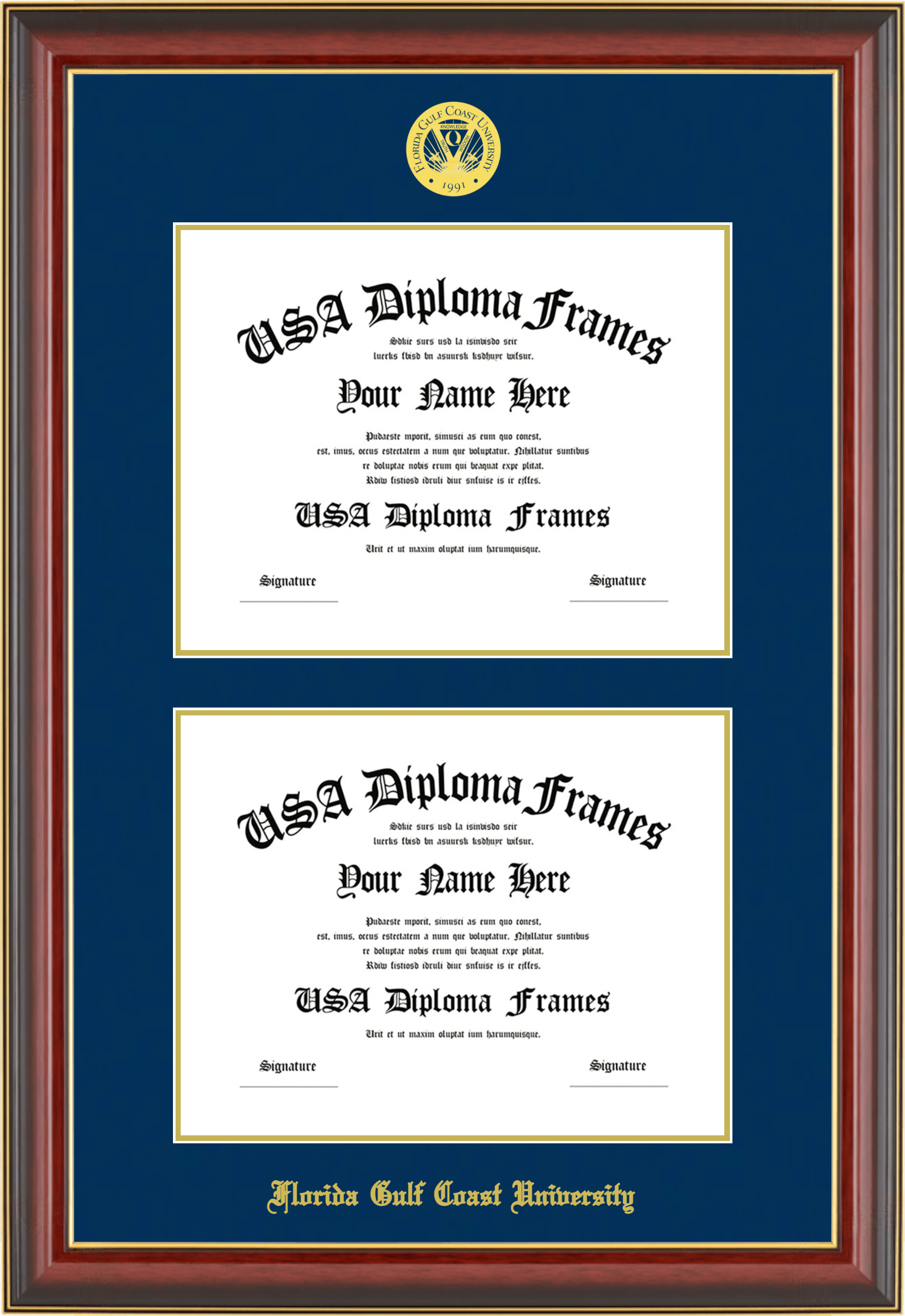 Florida Gulf Coast University Double Diploma Frame – Cherry Mahogany Gold Trim Glossy – Navy and Gold Mat