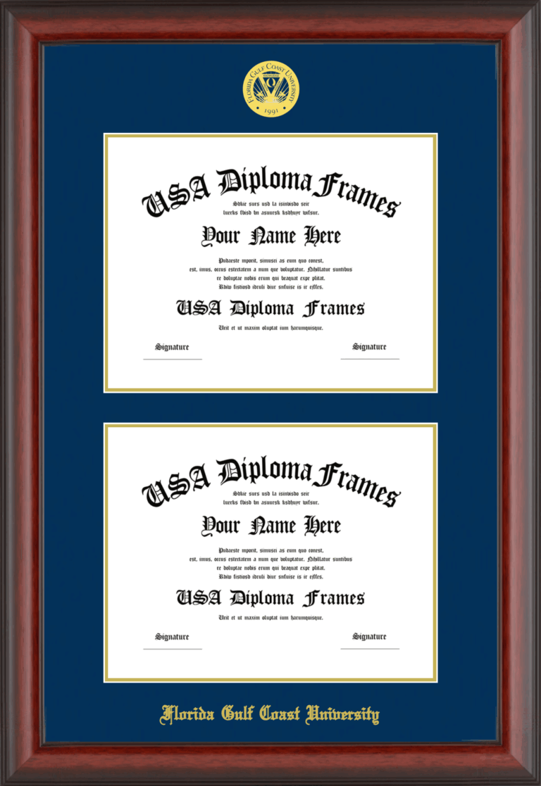 Florida Gulf Coast University Double Diploma Frame- Cherry Mahogany Matte – Navy and Gold Mat