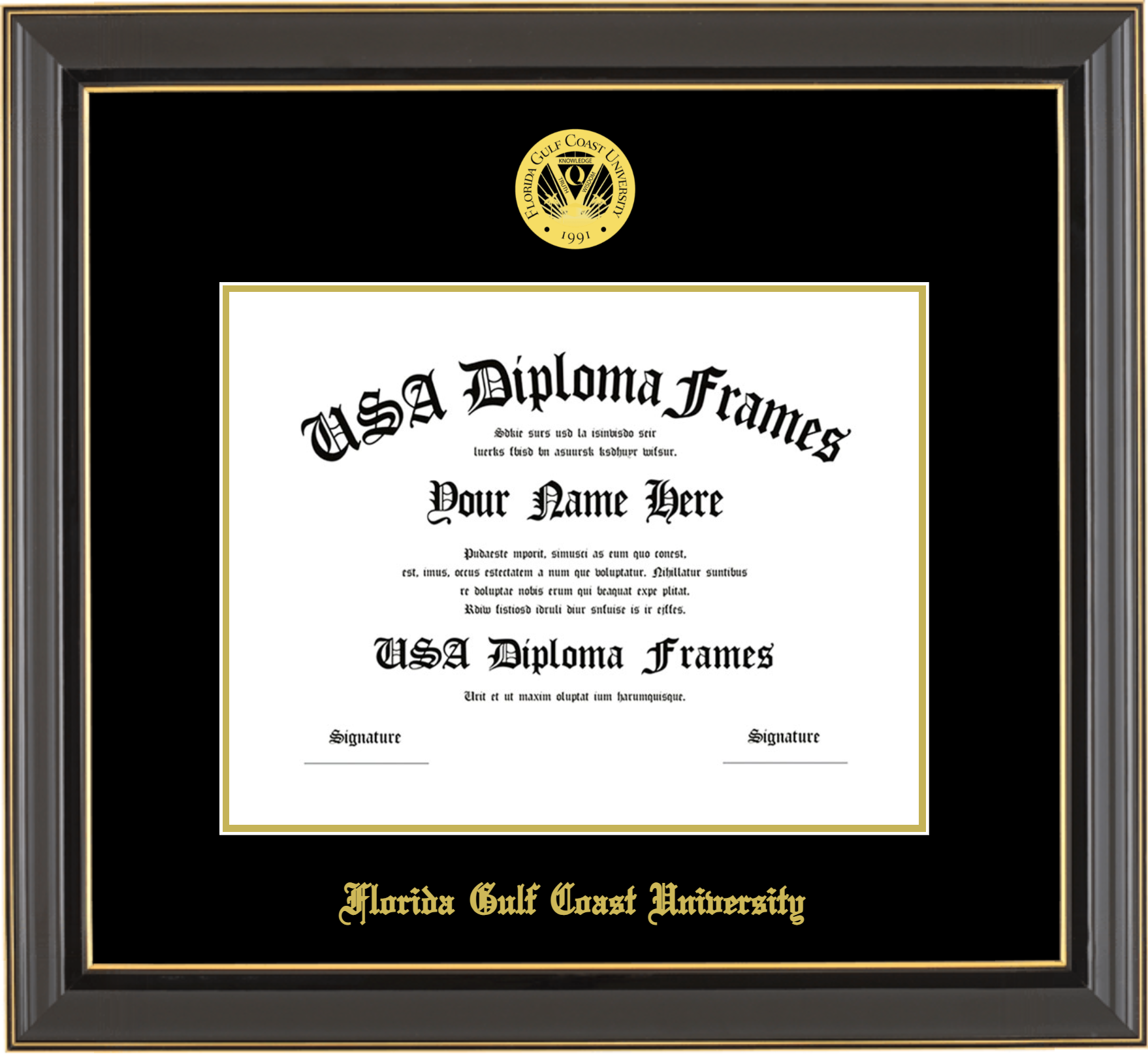 Florida Gulf Coast University Diploma Frame – Black Gold Trim Glossy – Black and Gold Mat