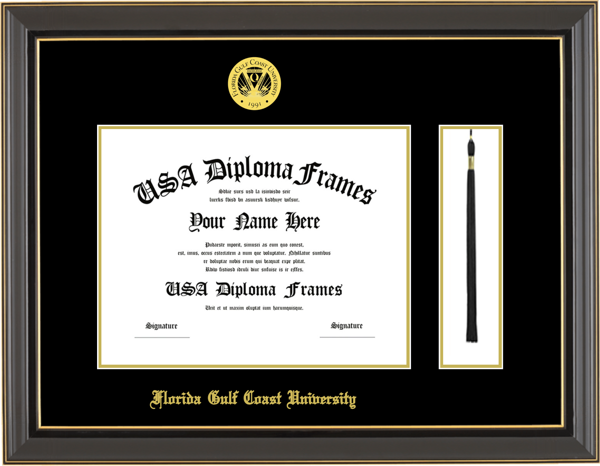 Florida Gulf Coast University Diploma Frame with Tassel – Black Gold Trim Glossy – Black and Gold Mat