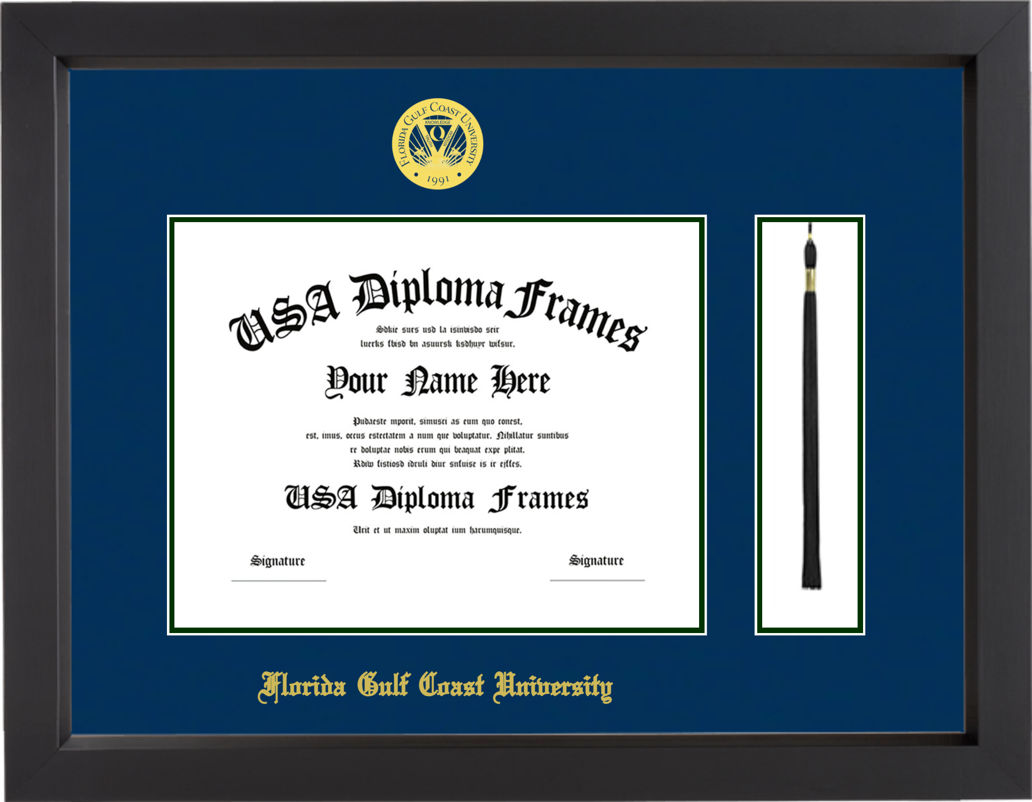 Florida Gulf Coast University Diploma Frame with Tassel – Black Matte – Navy and Winter Green Mat