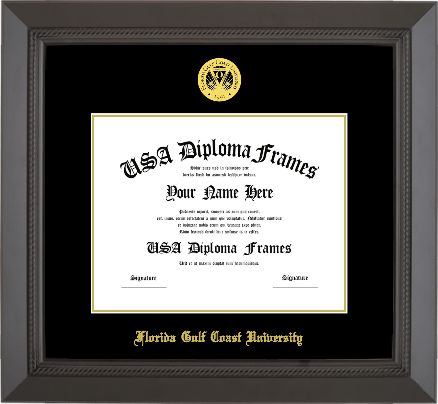 Florida Gulf Coast University Diploma Frame – Black Rope – Black and Gold Mat