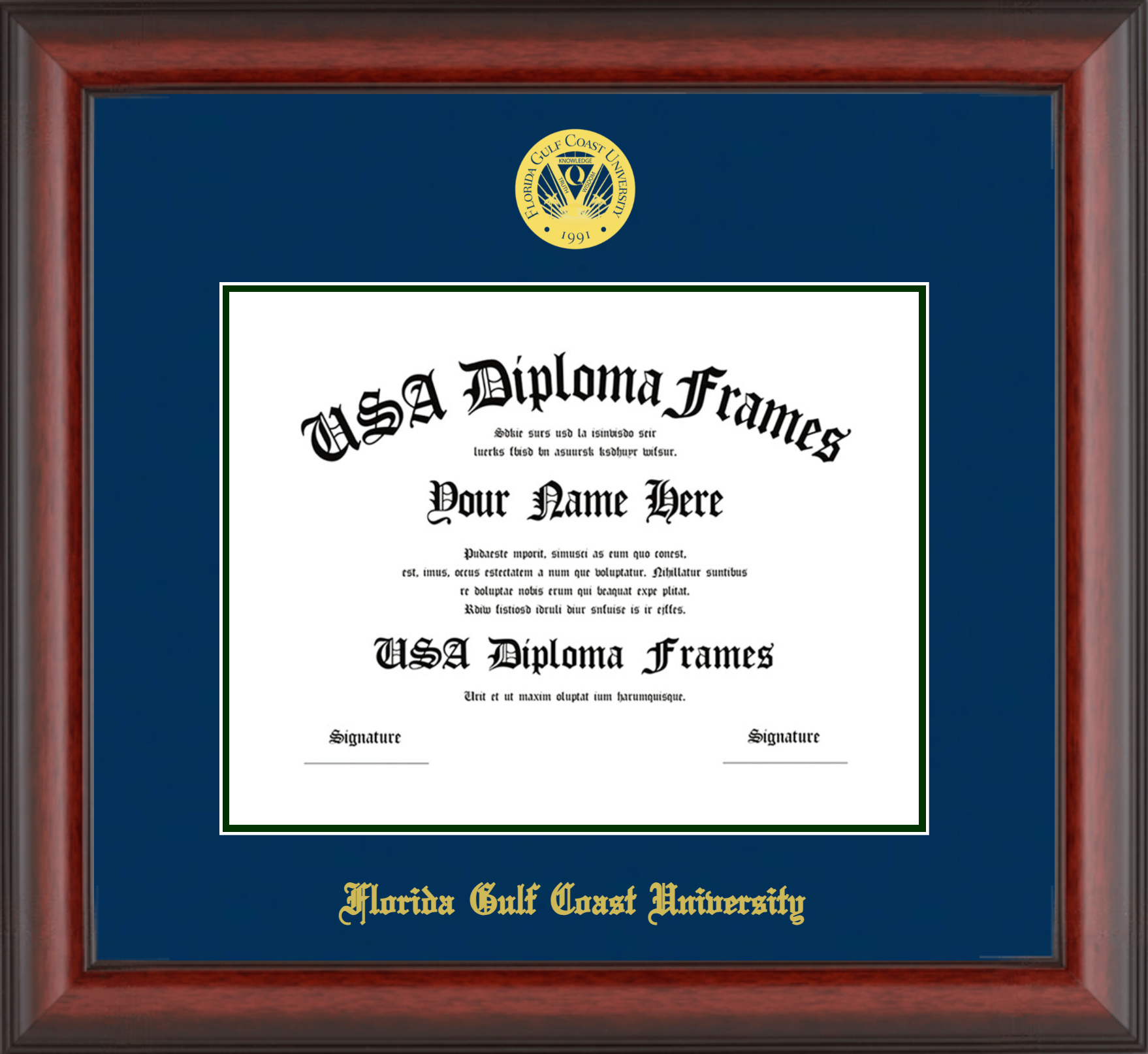 Florida Gulf Coast University Diploma Frame – Cherry Mahogany Matte – Navy and Winter Green Mat