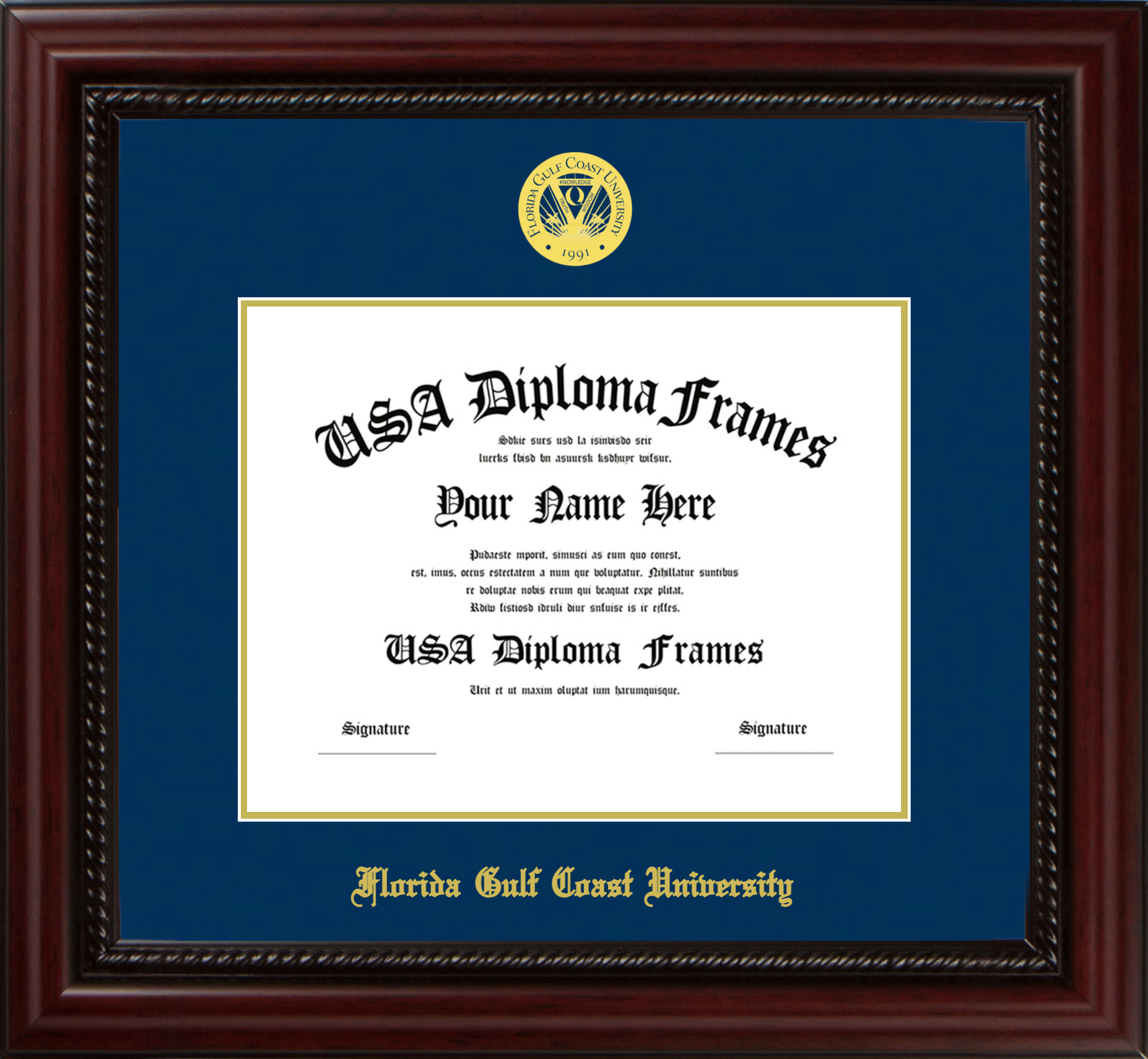 Florida Gulf Coast University Diploma Frame – Executive Cherry Rope – Navy and Gold Mat