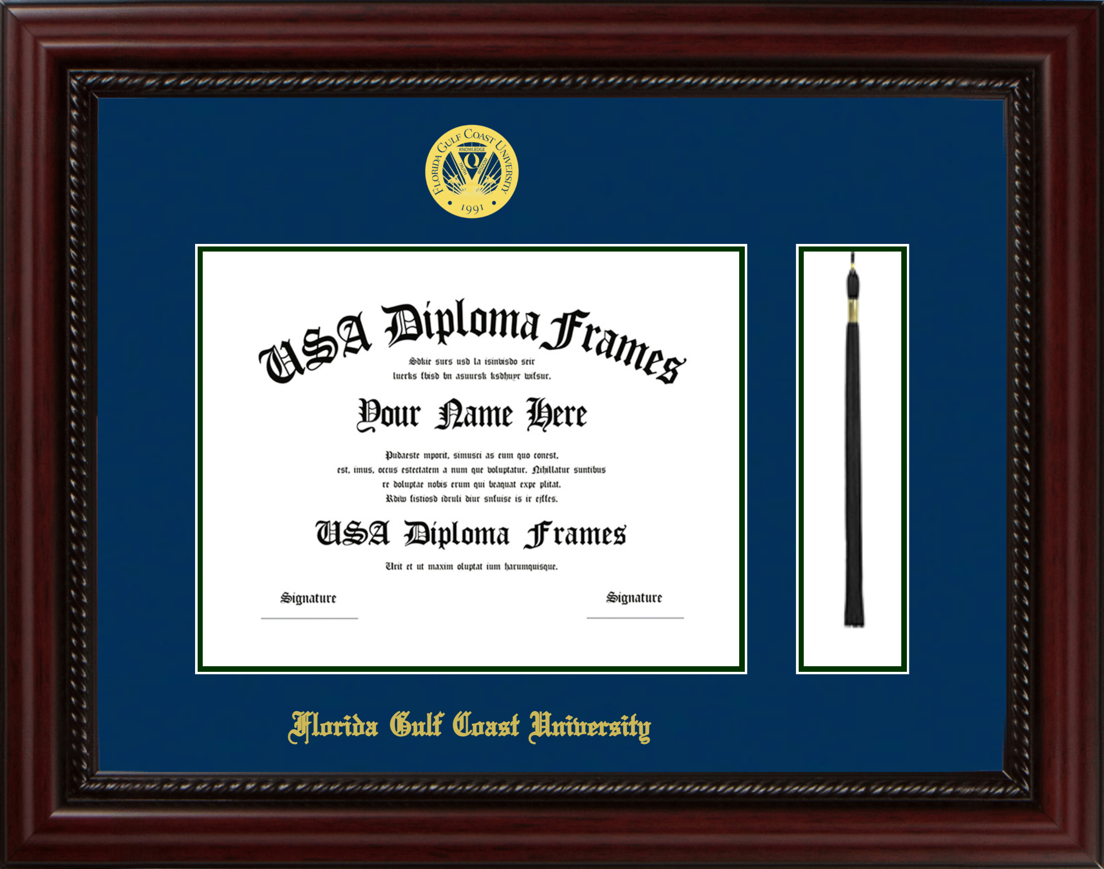 Florida Gulf Coast University Diploma Frame with Tassel – Executive Cherry Rope – Navy and Winter Green Mat