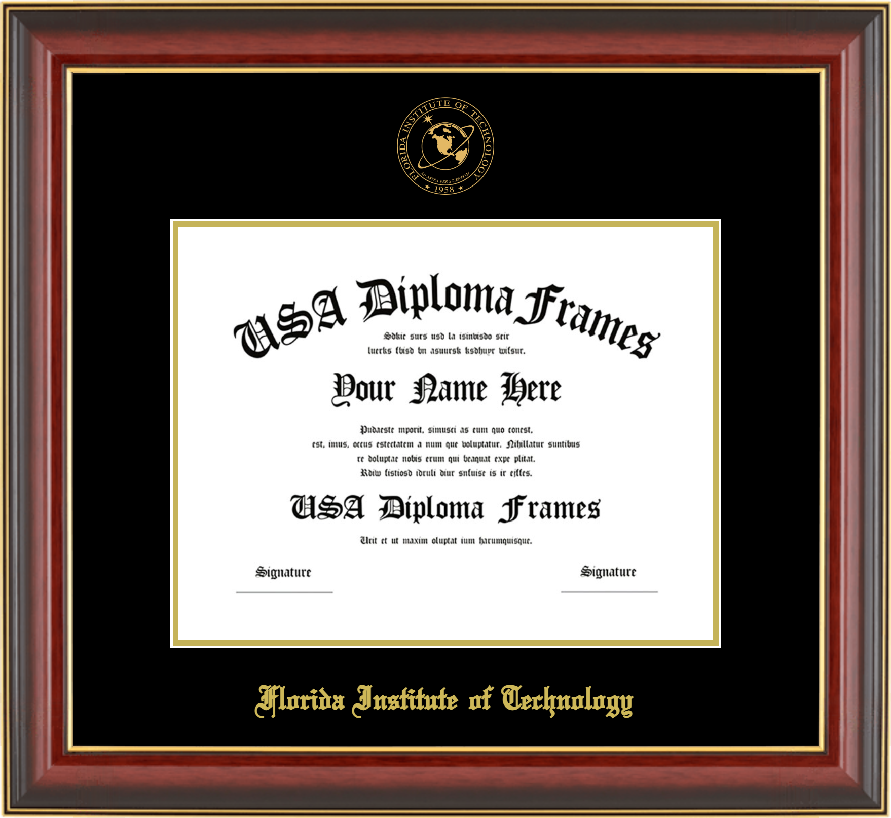 Florida Institute of Technology Diploma Frame – Cherry Mahogany Gold Trim Glossy – Black Mat – Gold Accent Mat