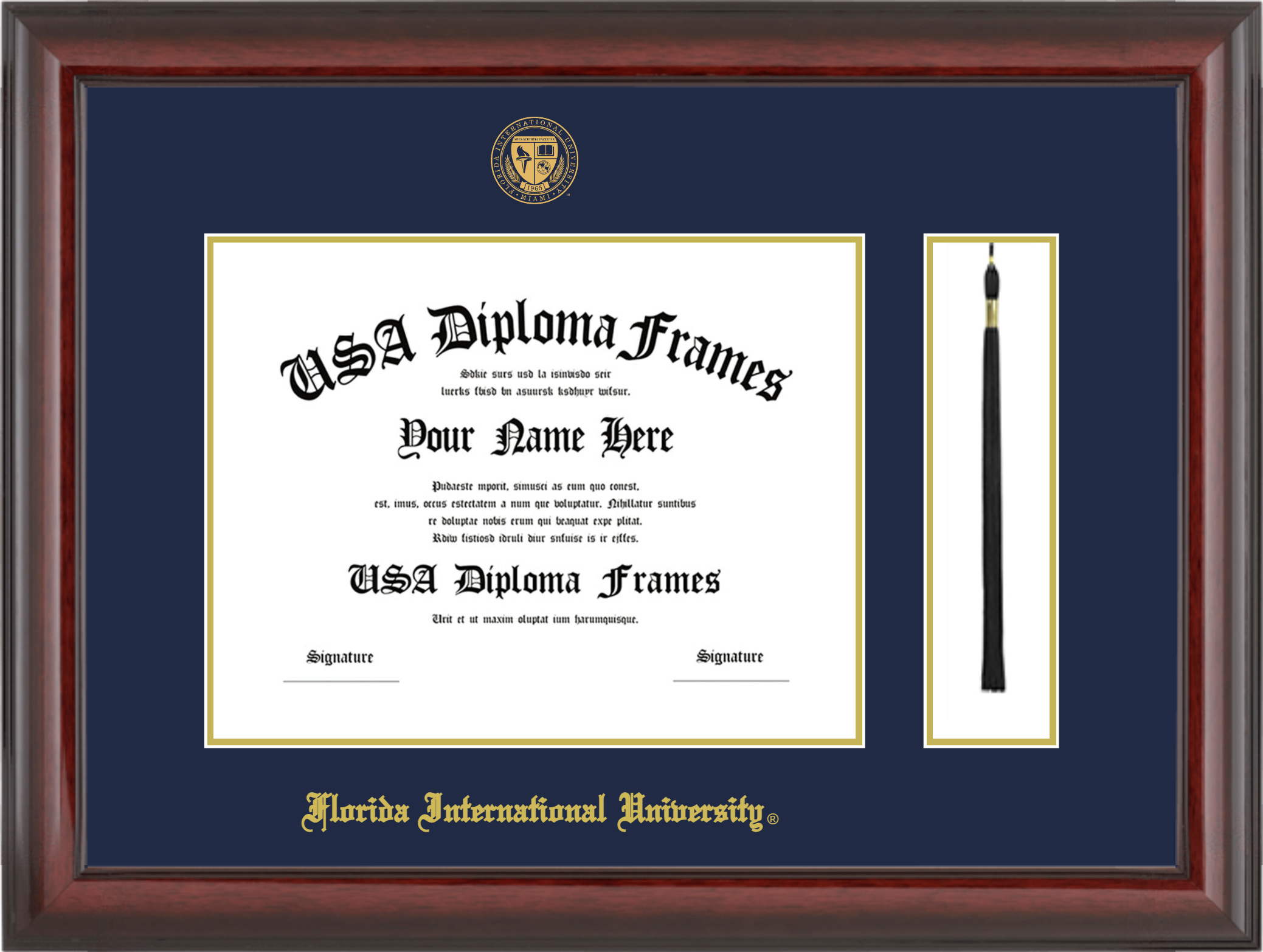 Florida International University – Single Horizontal Document ( Bachelors ) – Cherry Mahogany Glossy – Navy Mat – Gold Accent Mat – With Tassel(Default) – With Seal(University Seal Gold) – With Gold Embossing (Florida International University)