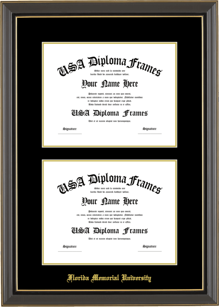Florida Memorial University Double Diploma Frame – Double Document – Black Gold Trim Glossy – Black and Gold Mat