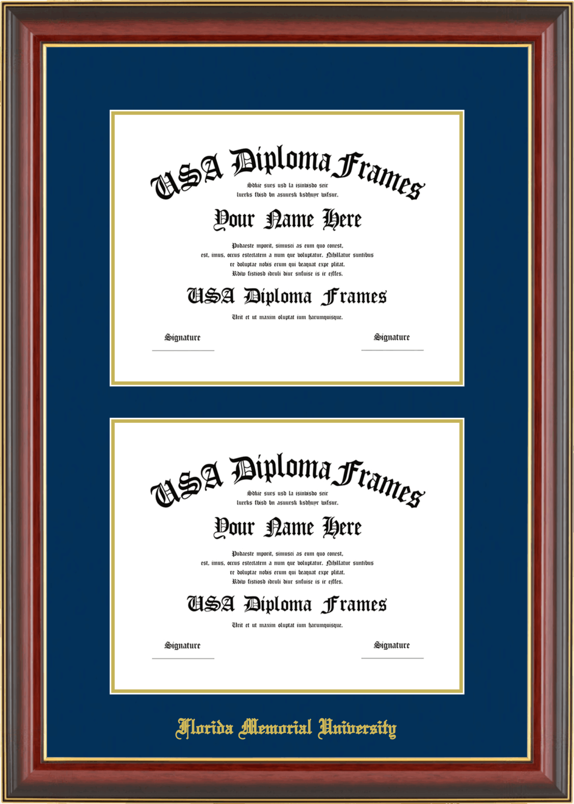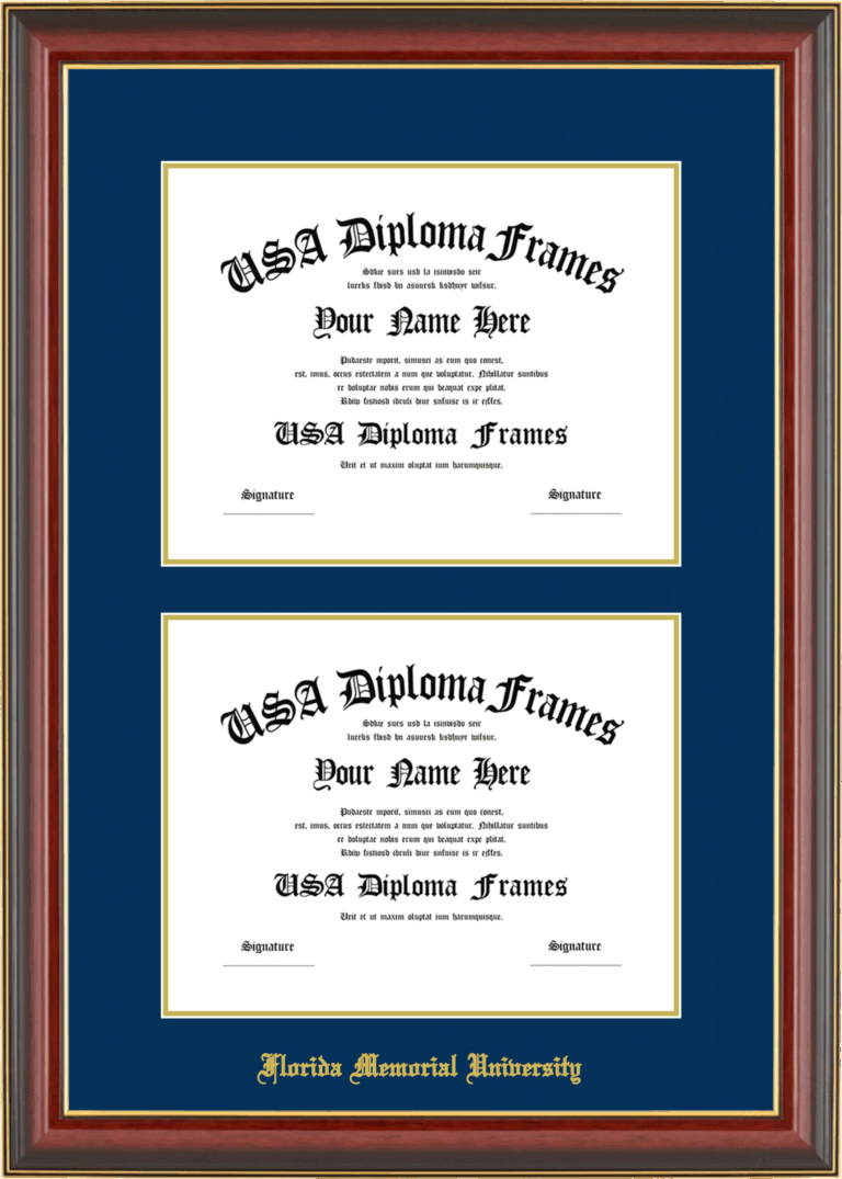 Florida Memorial University Double Diploma Frame – Double Document – Cherry Mahogany Gold Trim Glossy – Navy and Gold Mat