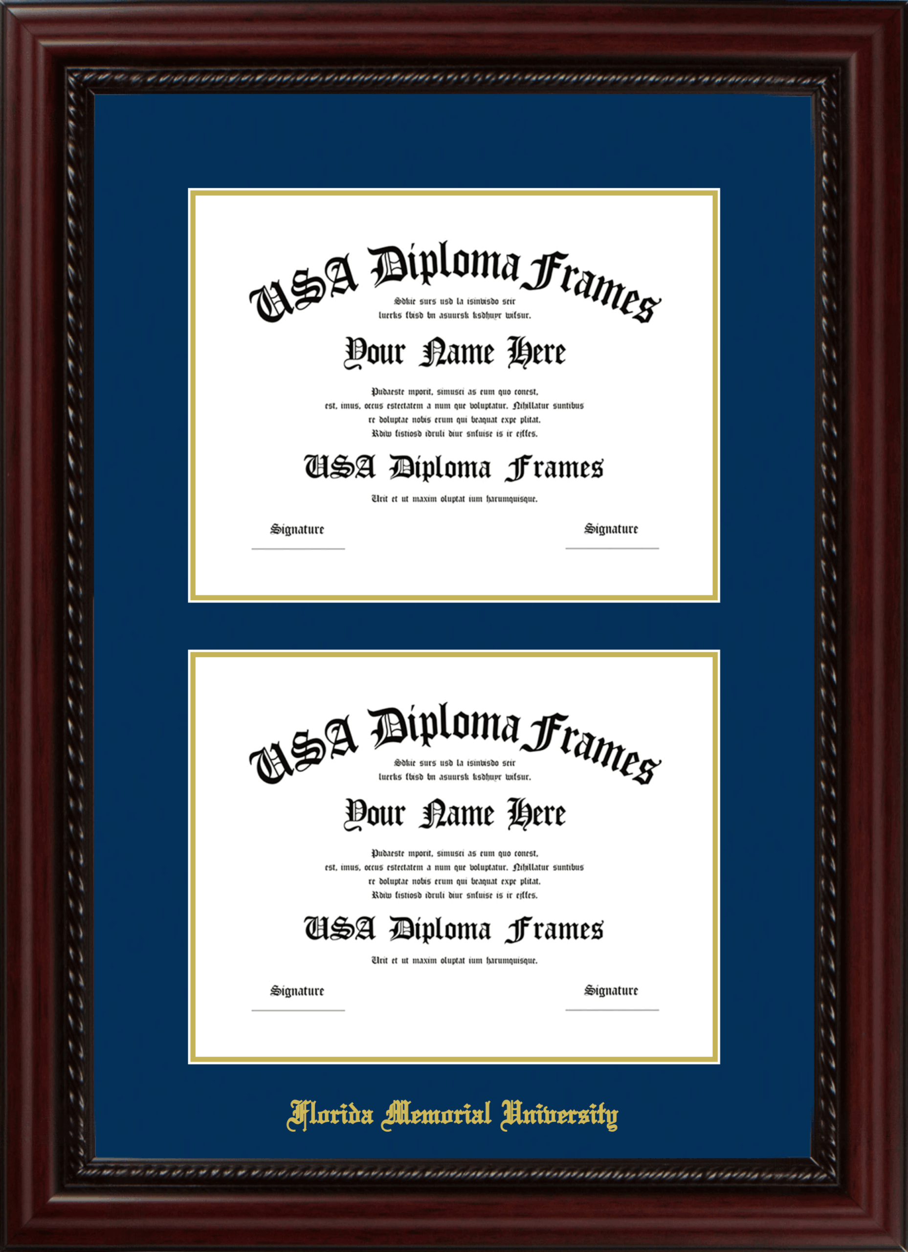 Florida Memorial University Double Diploma Frame – Double Document – Executive Cherry Rope – Navy and Gold Mat