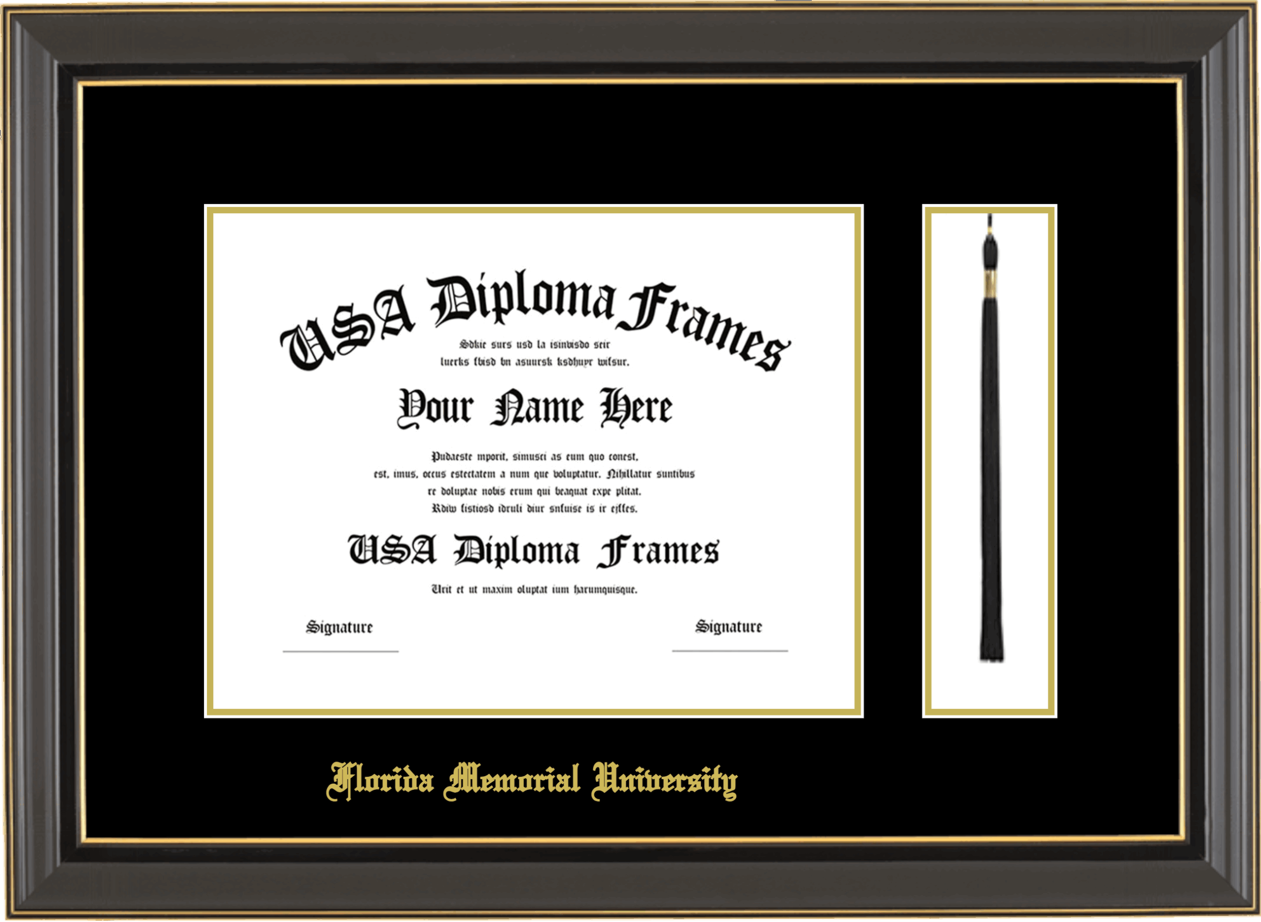 Florida Memorial University – Single Horizontal Document ( 8 1/2″x11″ ) – Black Gold Trim Glossy – Black Mat – Gold Accent Mat – With Tassel(Default) – With Gold Embossing (Florida Memorial University)