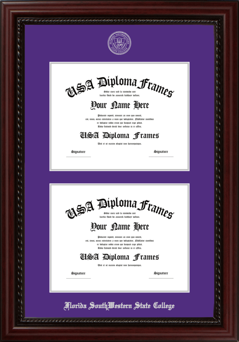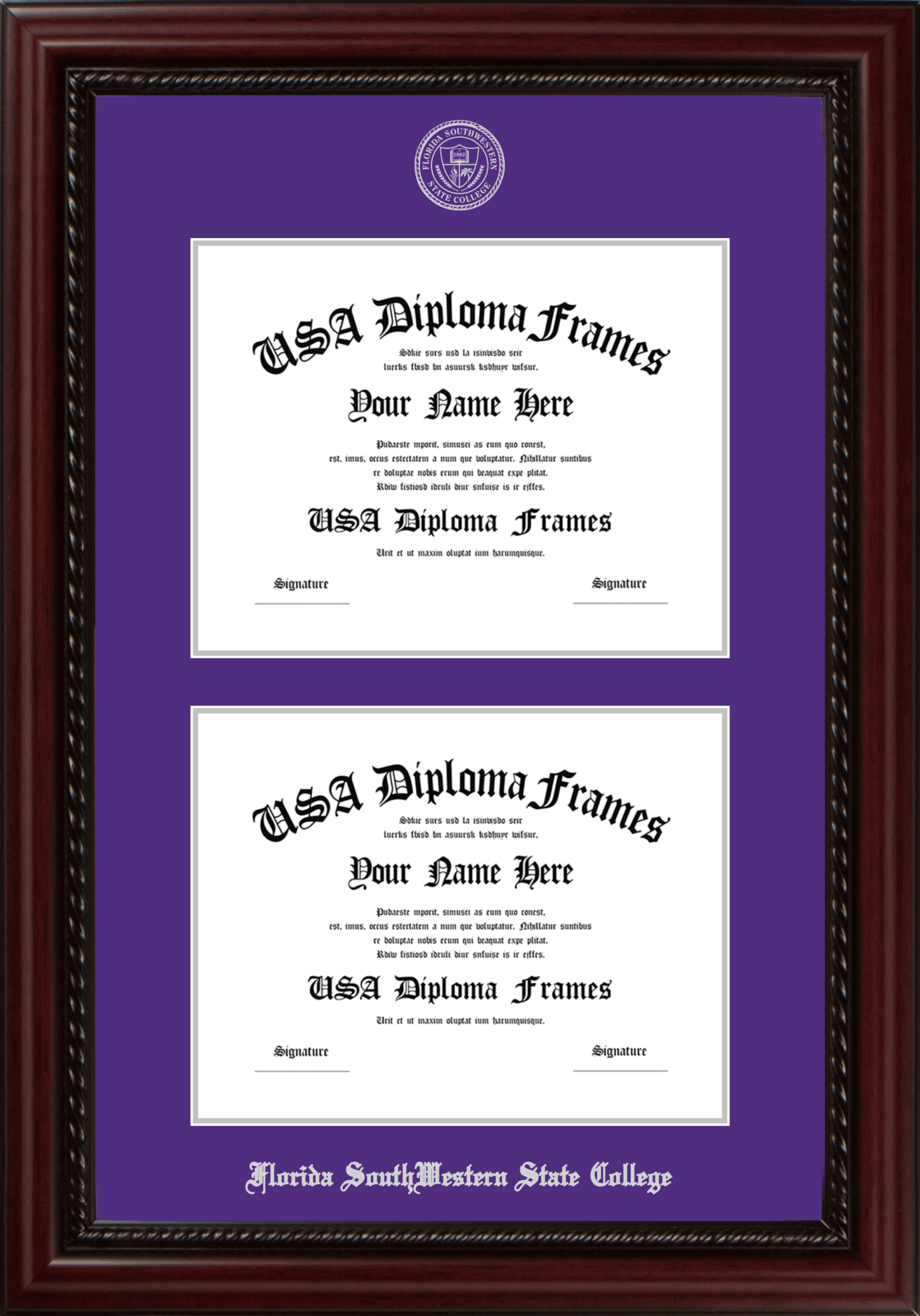Florida SouthWestern State College Double Diploma Frame – Double Document – Executive Cherry Rope – Purple and Silver Mat