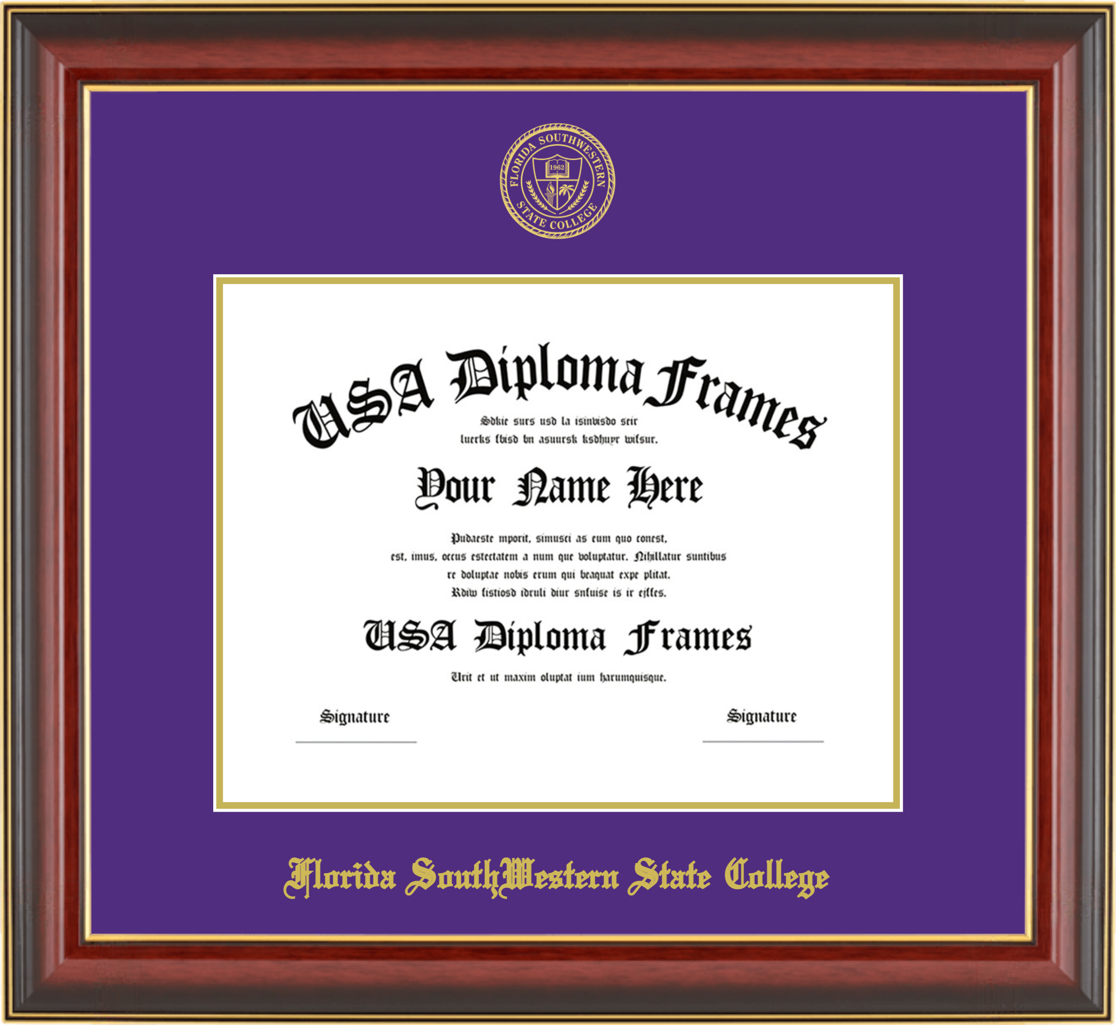 Florida SouthWestern State College Diploma Frame – Cherry Mahogany Gold Trim Glossy – Purple and Gold Mat