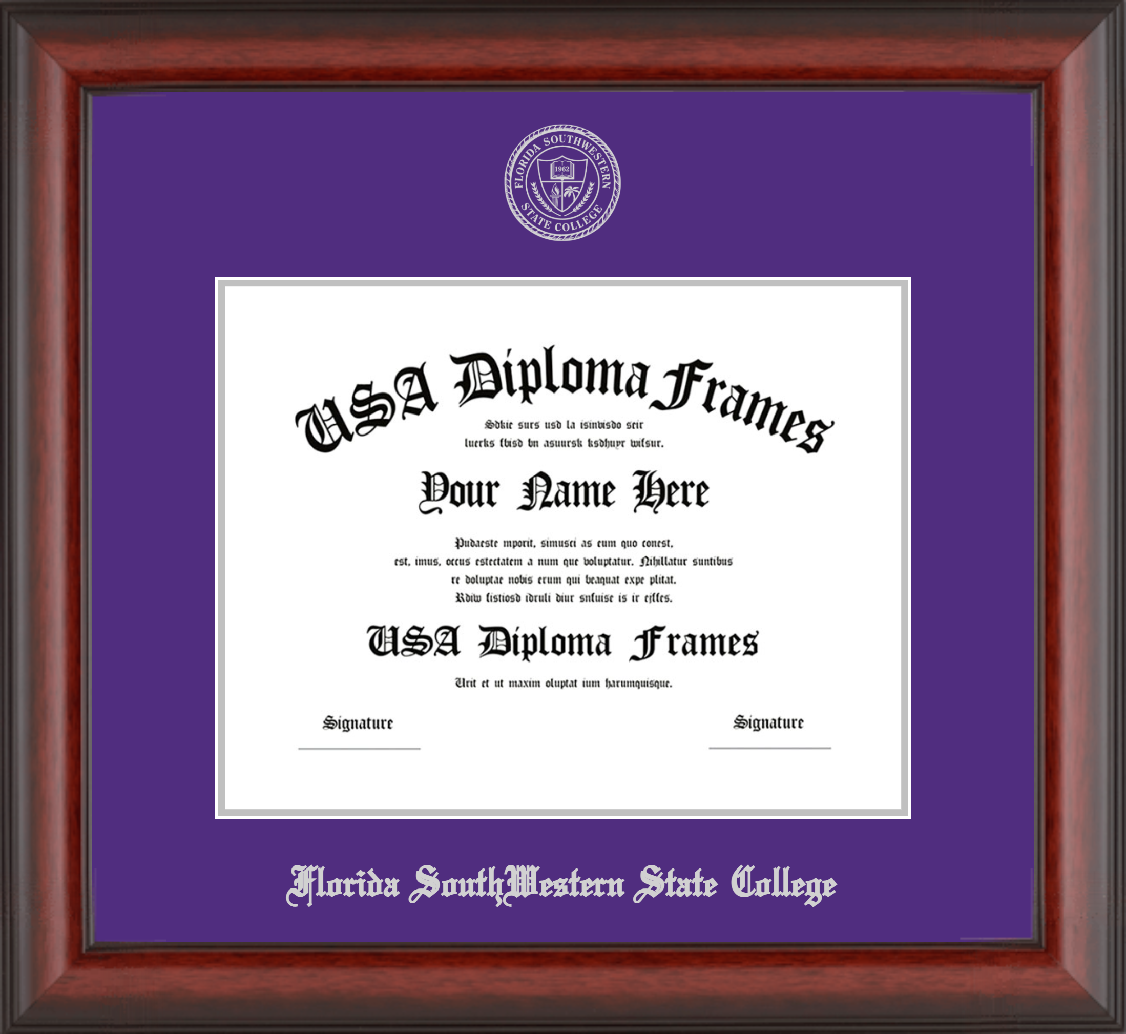Florida SouthWestern State College Diploma Frame – Cherry Mahogany Matte – Purple and Silver Mat