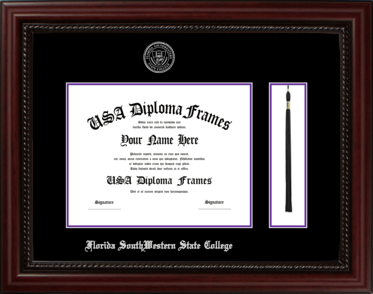 Florida SouthWestern State College Diploma Frame with Tassel – Executive Cherry Rope – Black and Purple Mat – Silver Seal
