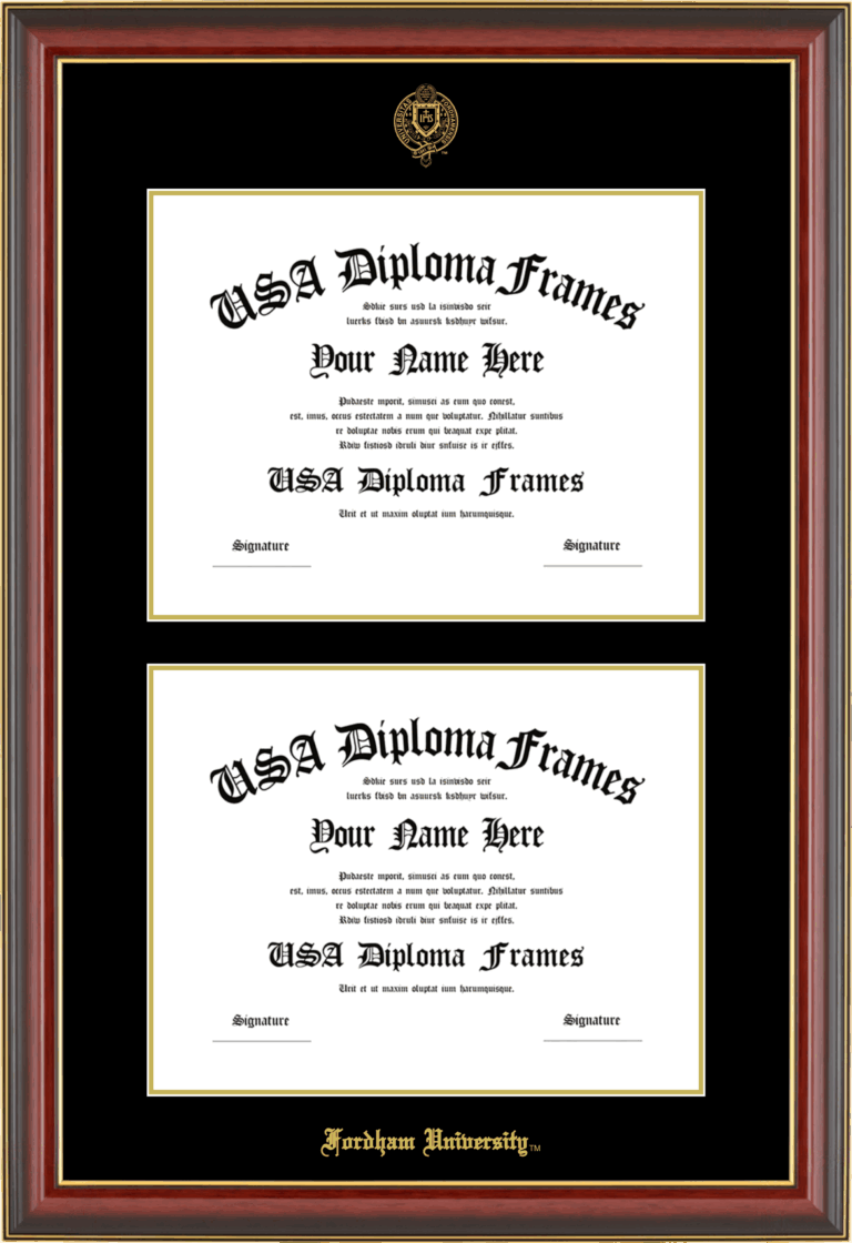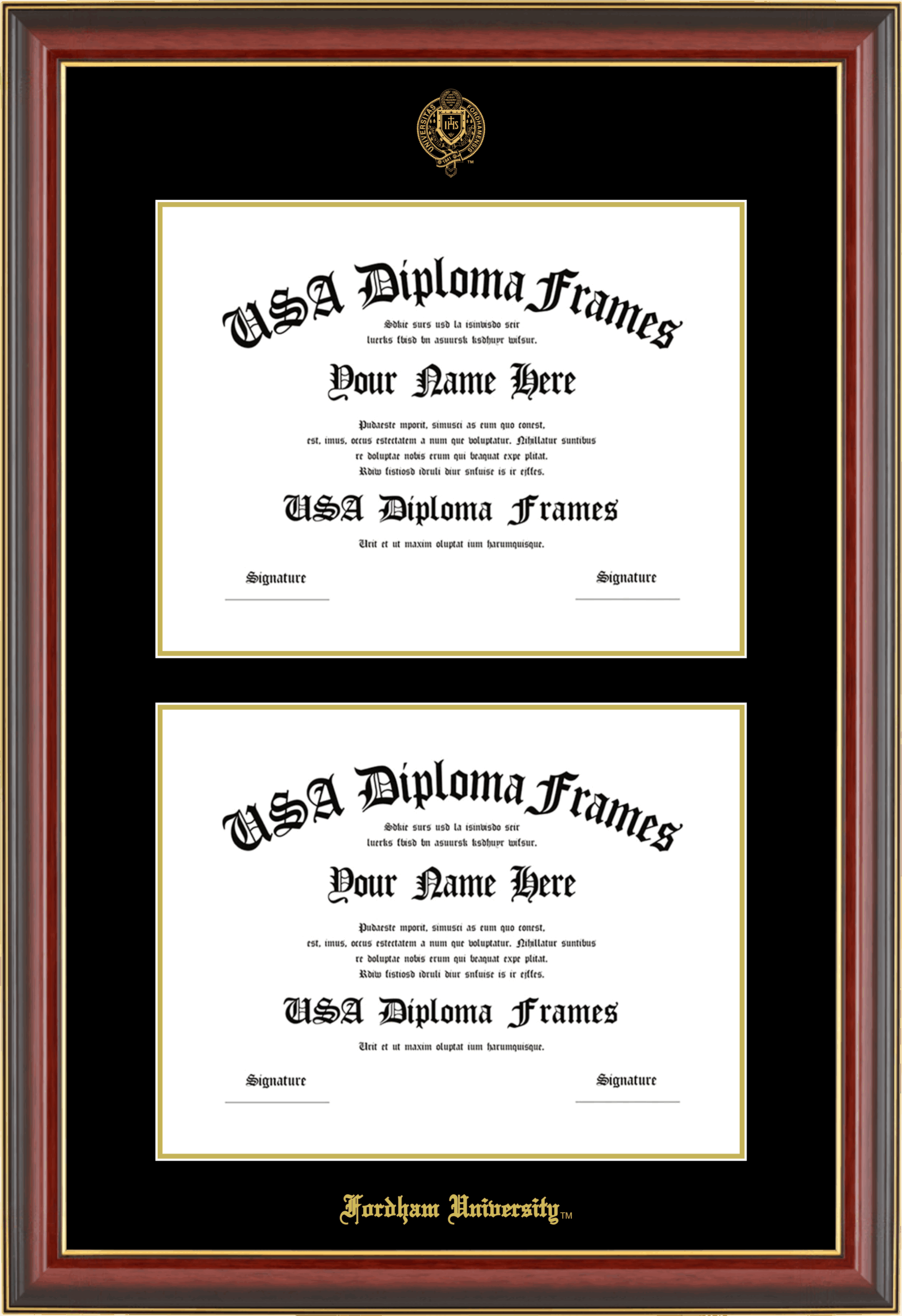 Fordham University Double Diploma Frame – Double Document – Cherry Mahogany Gold Trim Glossy – Black and Gold Mat
