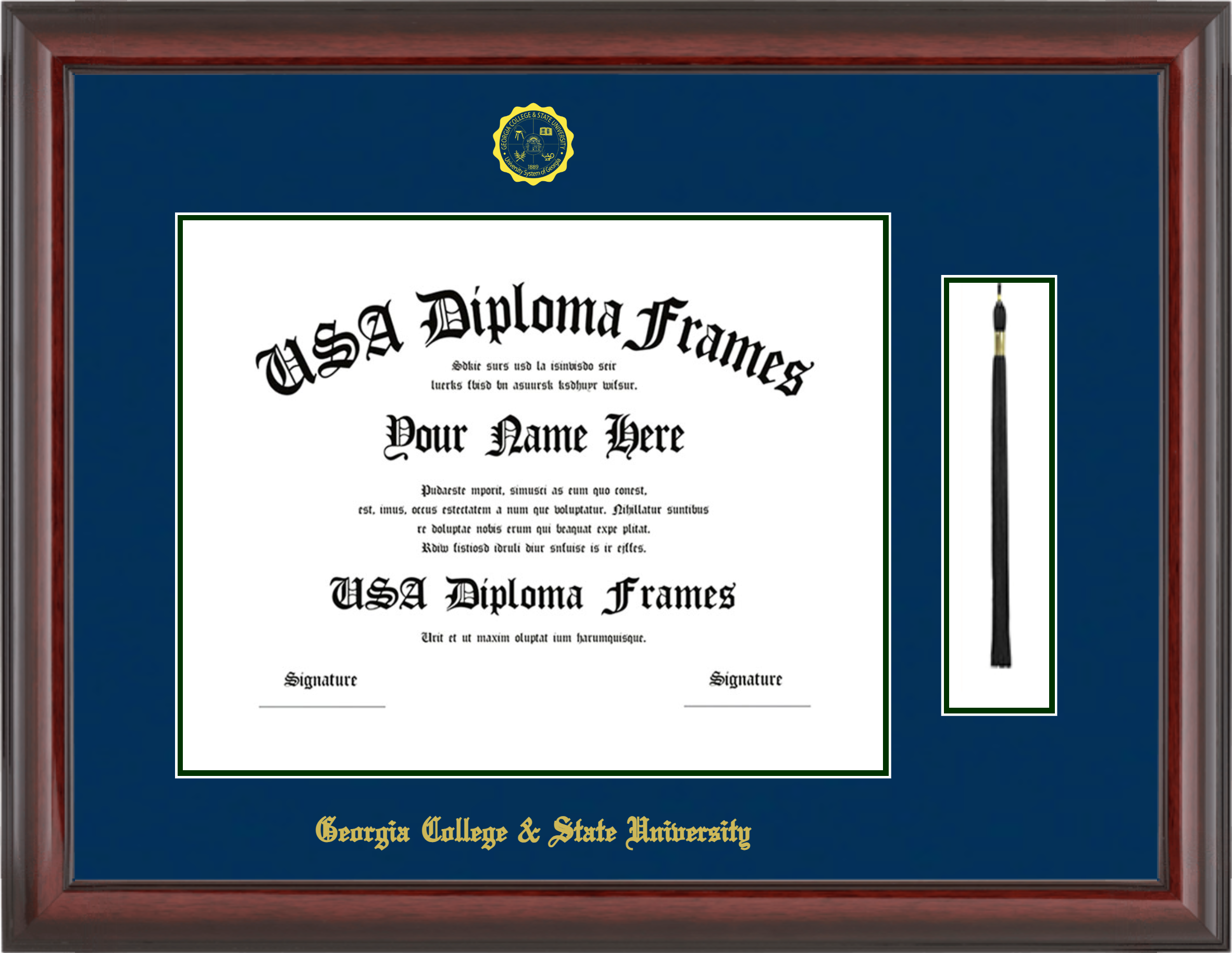 Georgia College & State University Diploma Frame with Tassel – Cherry Mahogany Glossy – Navy and Winter Green Mat