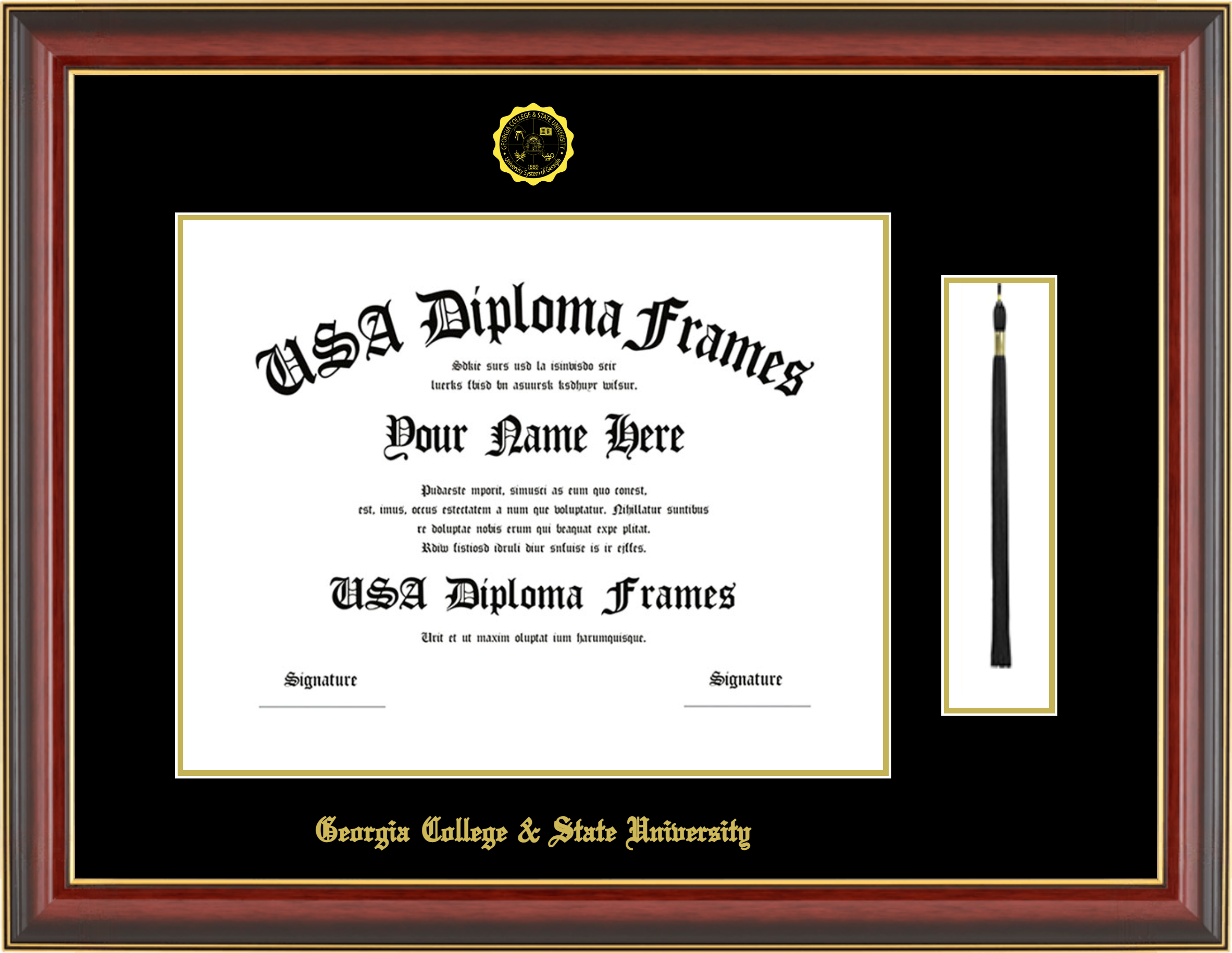 Georgia College & State University Diploma Frame with Tassel – Cherry Mahogany Gold Trim Glossy – Black and Gold Mat
