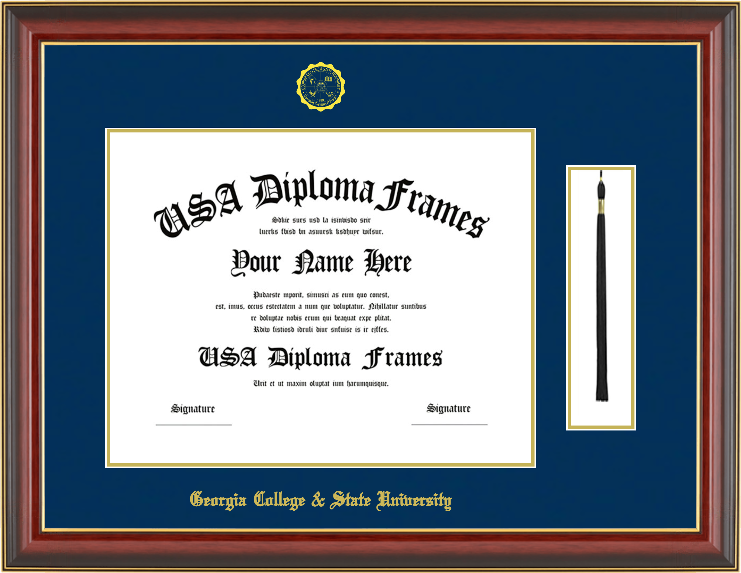 Georgia College & State University Diploma Frame with Tassel – Cherry Mahogany Gold Trim Glossy – Navy and Gold Mat