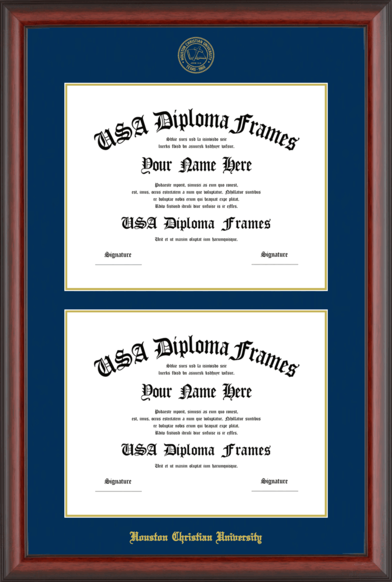 Houston Christian University Double Diploma Frame – HCU Double Document – Cherry Mahogany Matte – Navy and Gold Mat