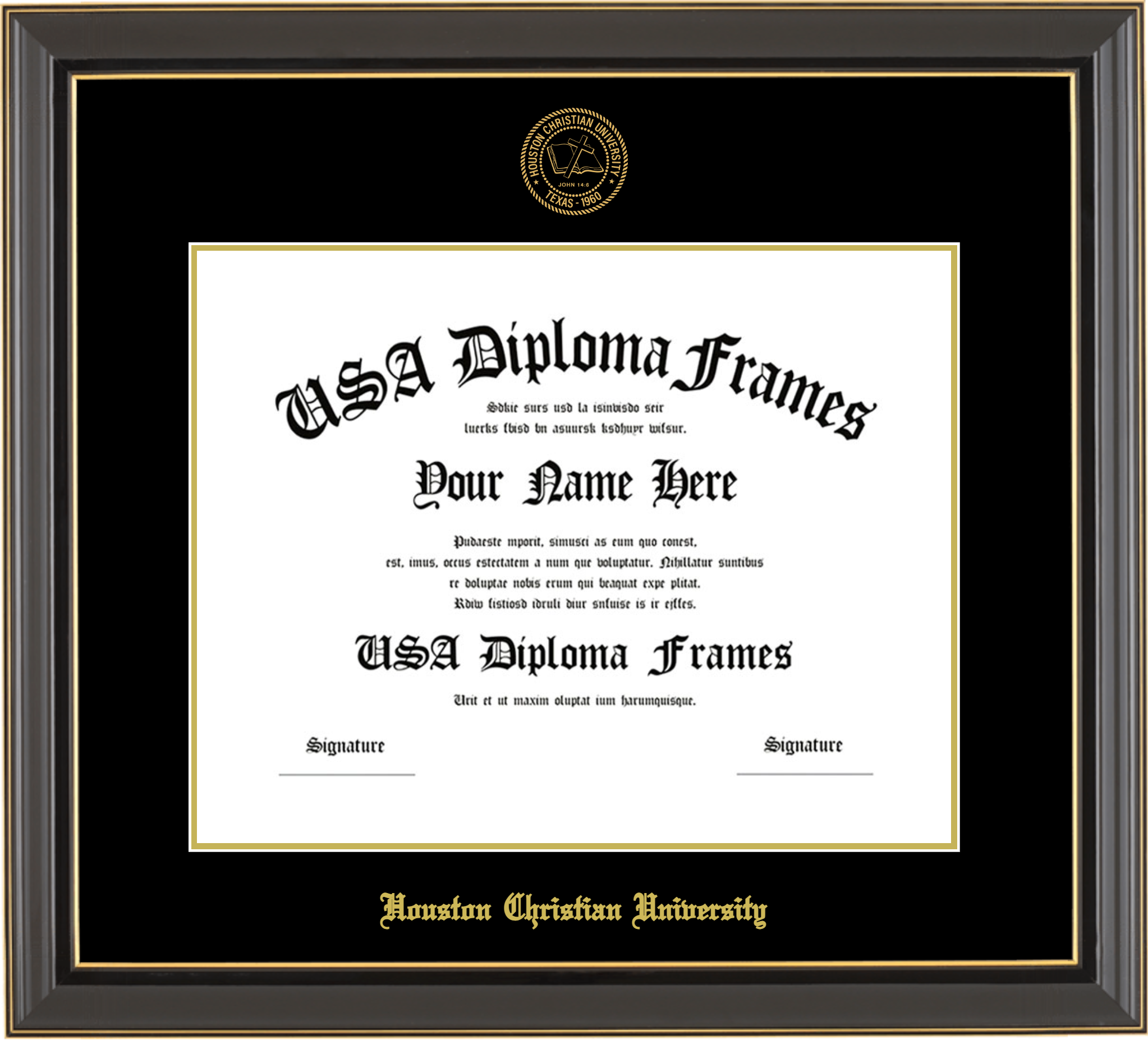 Houston Christian University Diploma Frame – HCU – Black Gold Trim Glossy – Black and Gold Mat