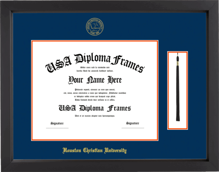Houston Christian University Diploma Frame with Tassel – HCU – Black Matte – Navy and Orange Mat