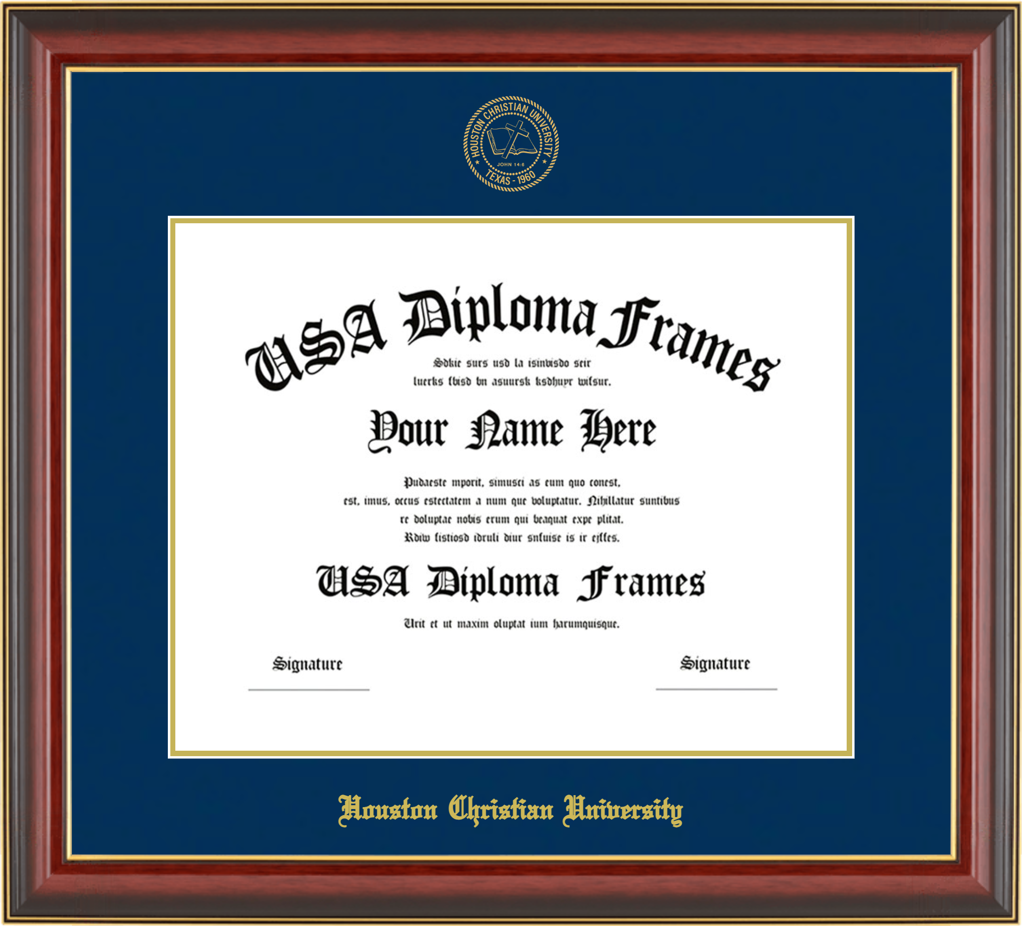 Houston Christian University Diploma Frame – HCU – Cherry Mahogany Gold Trim Glossy – Navy and Gold Mat