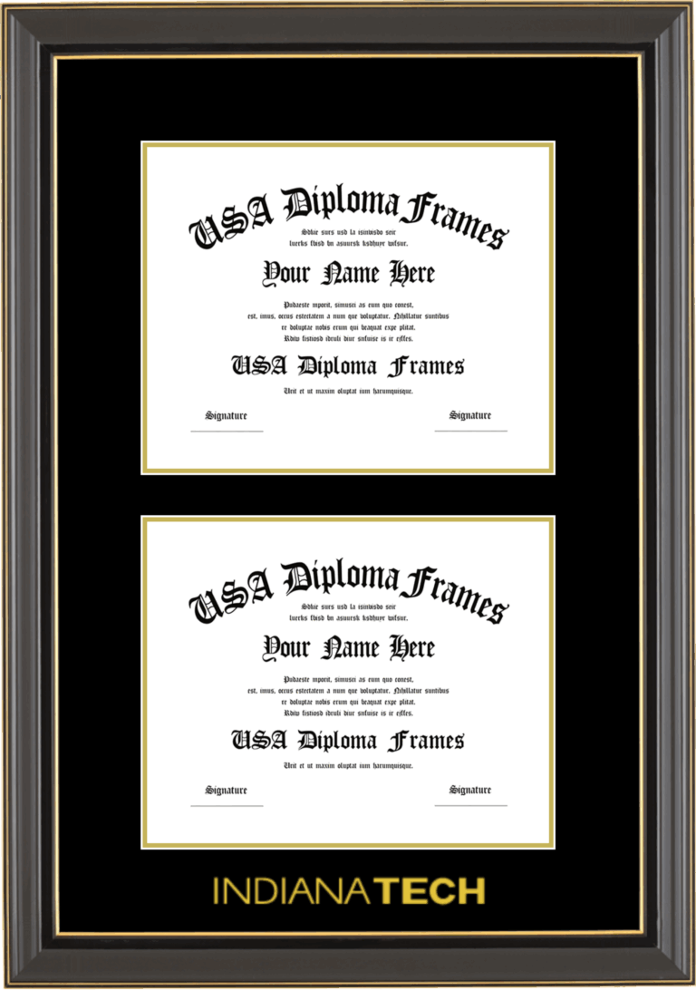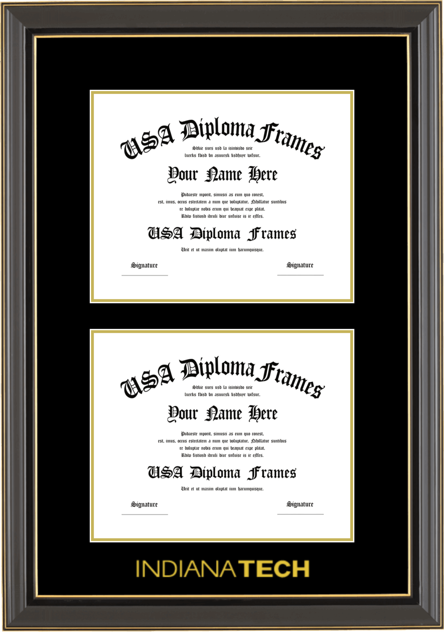 Indiana Tech Double Diploma Frame – Double Document – Black Gold Trim Glossy – Black and Gold Mat