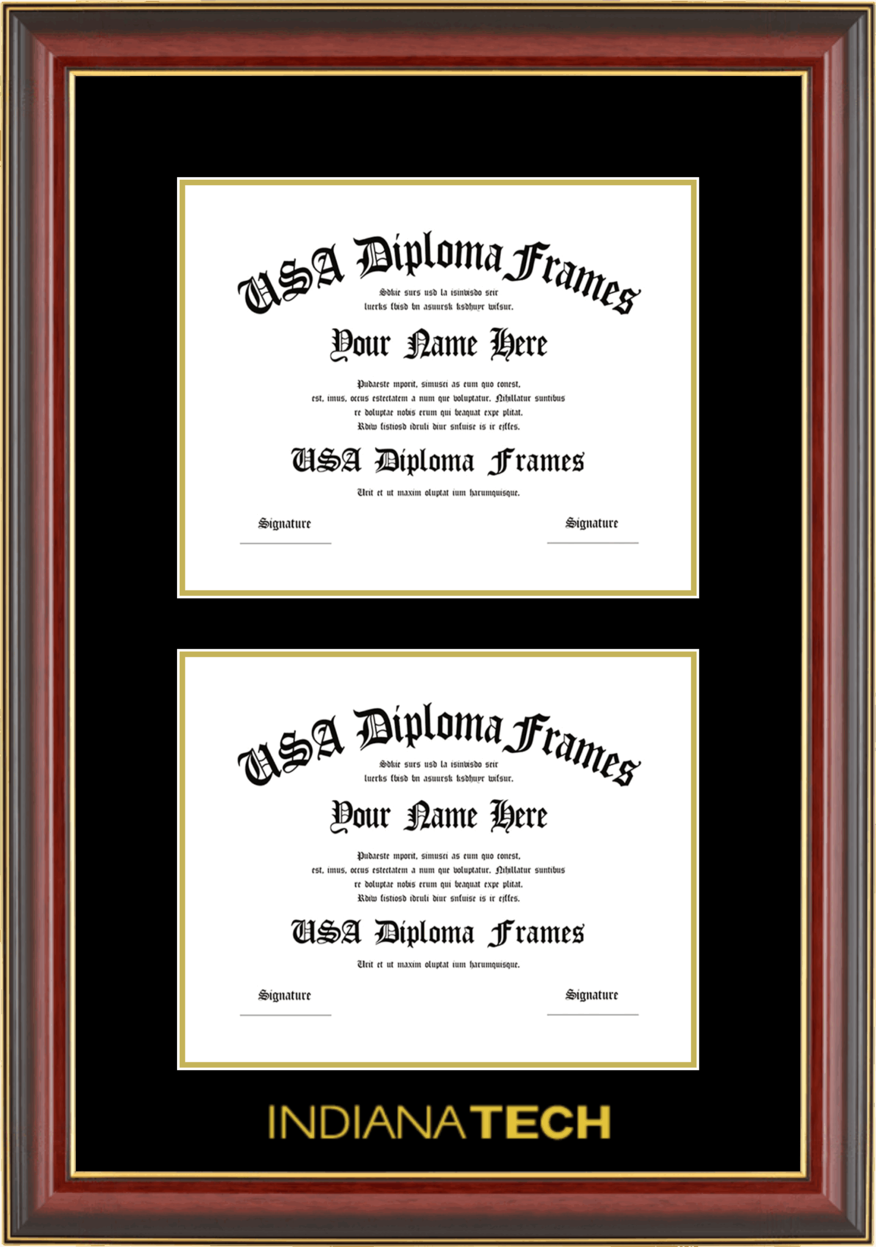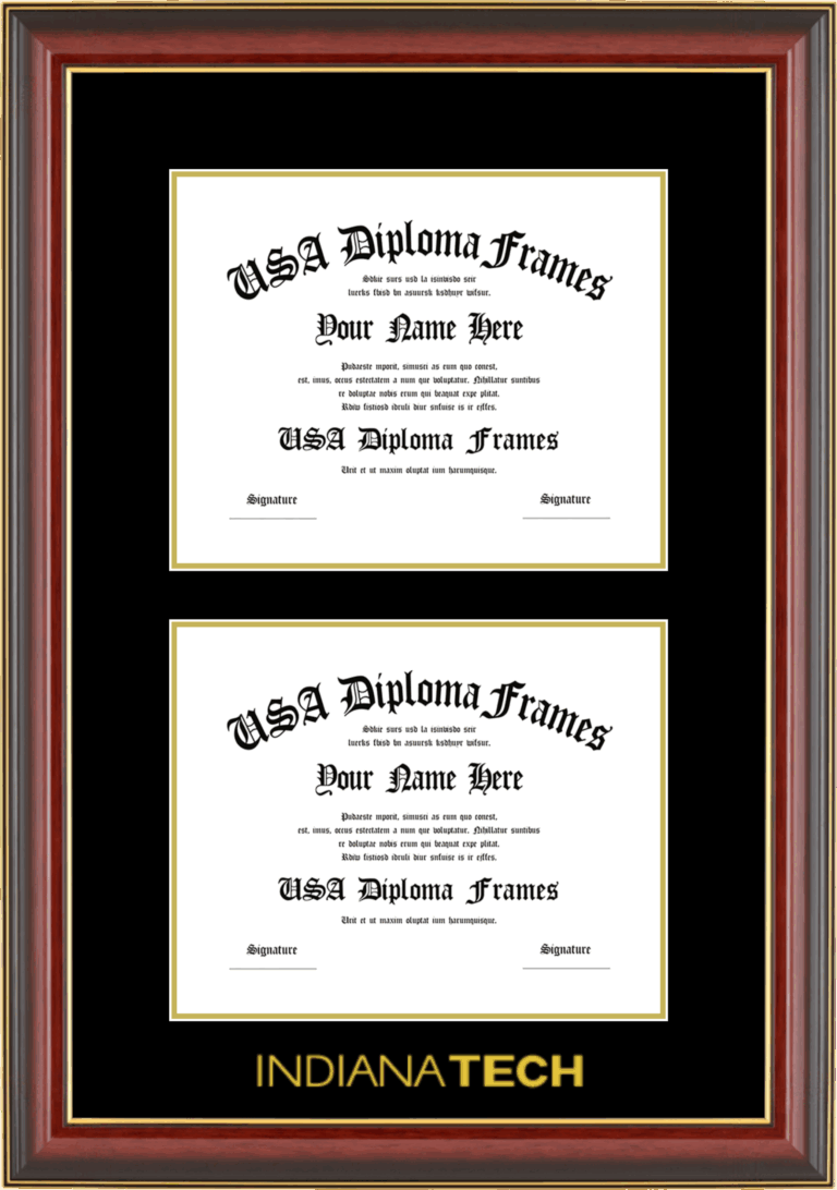 Indiana Tech Double Diploma Frame – Double Document – Cherry Mahogany Gold Trim Glossy – Black and Gold Mat