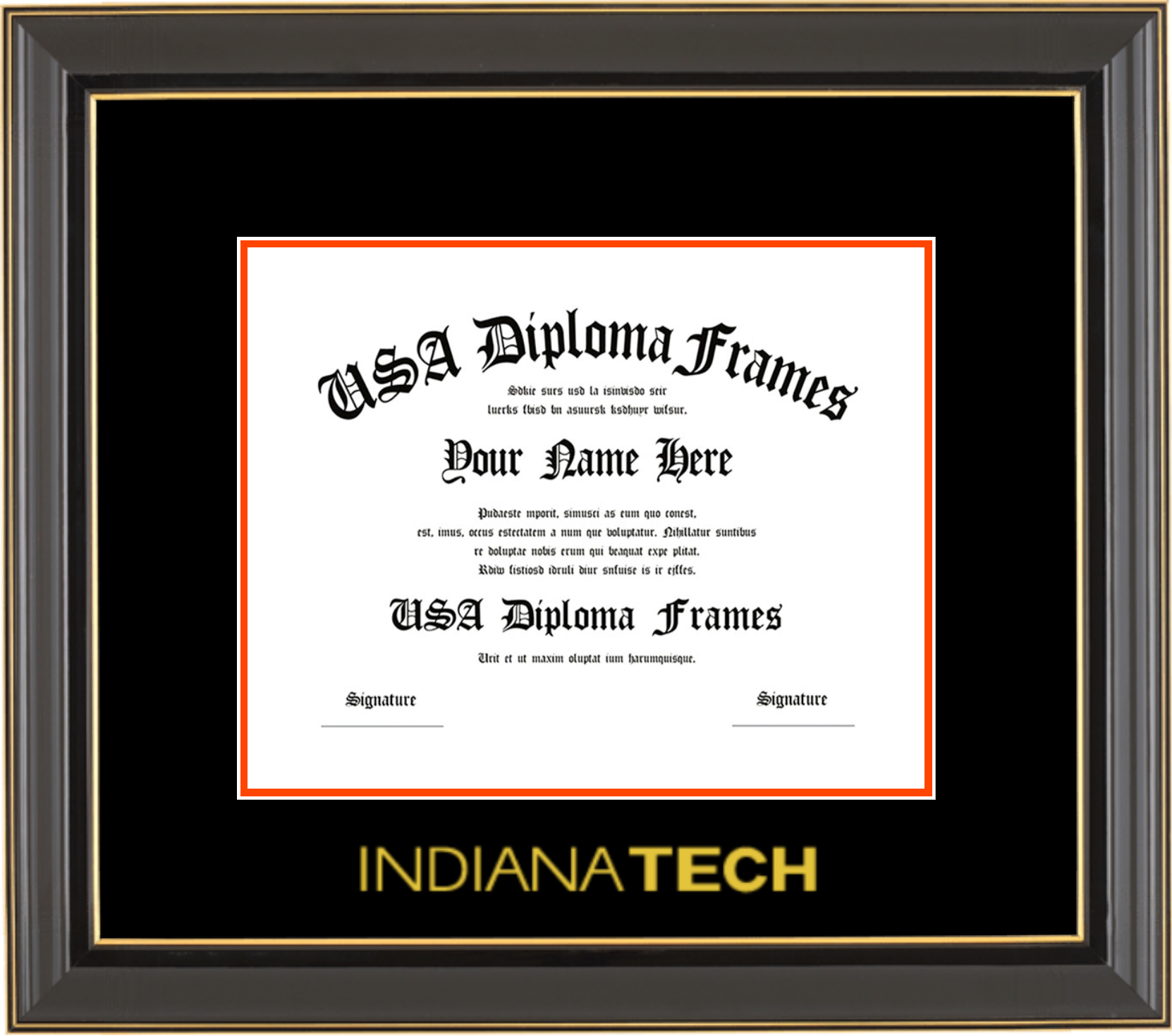 Indiana Tech – Single Horizontal Document ( Bachelors ) – Black Gold Trim Glossy – Black Mat – Orange Accent Mat – With Image Embossing(Gold)
