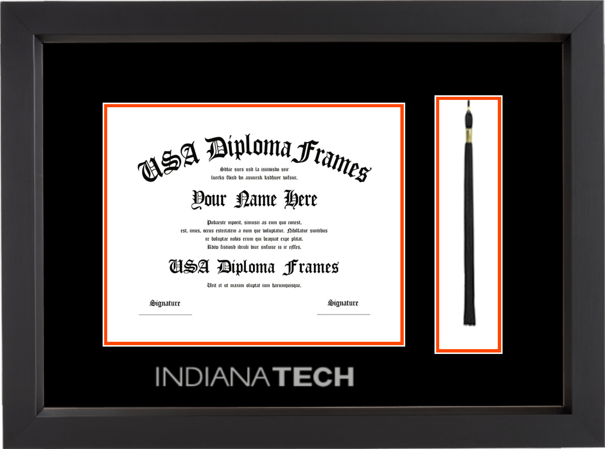Indiana Tech – Single Horizontal Document ( Bachelors ) – Black Matte – Black Mat – Orange Accent Mat – With Tassel(Default) – With Image Embossing(Silver)