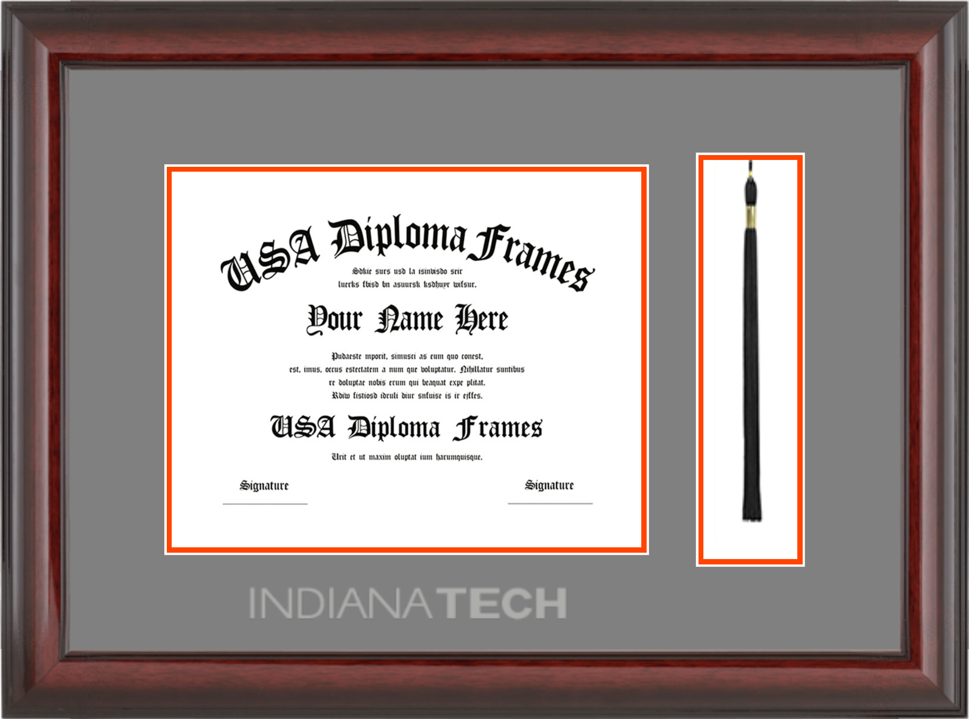 Indiana Tech – Single Horizontal Document ( Bachelors ) – Cherry Mahogany Glossy – Grey Mat – Orange Accent Mat – With Tassel(Default) – With Image Embossing(Silver)