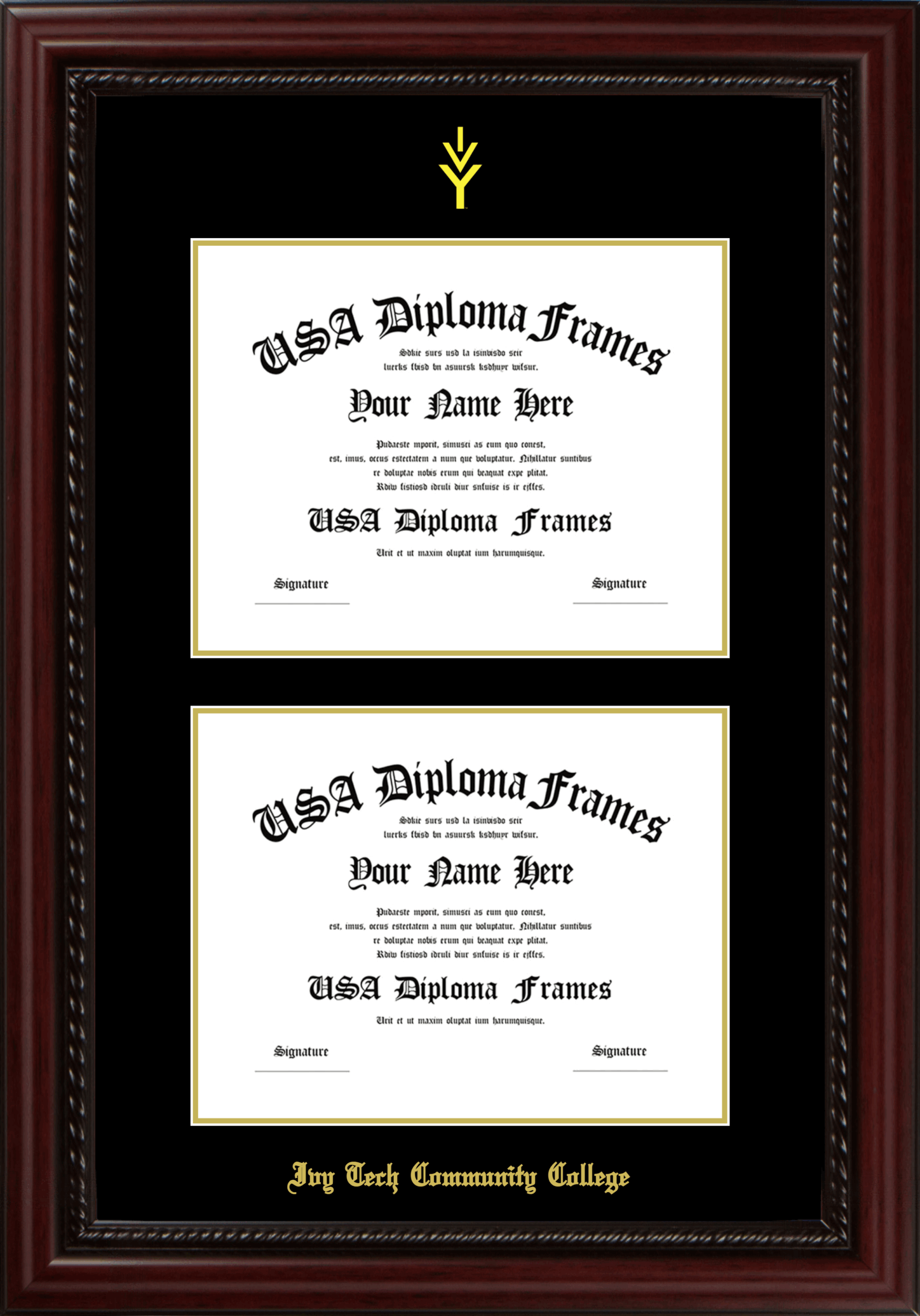 Ivy Tech Community College Double Diploma Frame – Double Document – Executive Cherry Rope – Black and Gold Mat