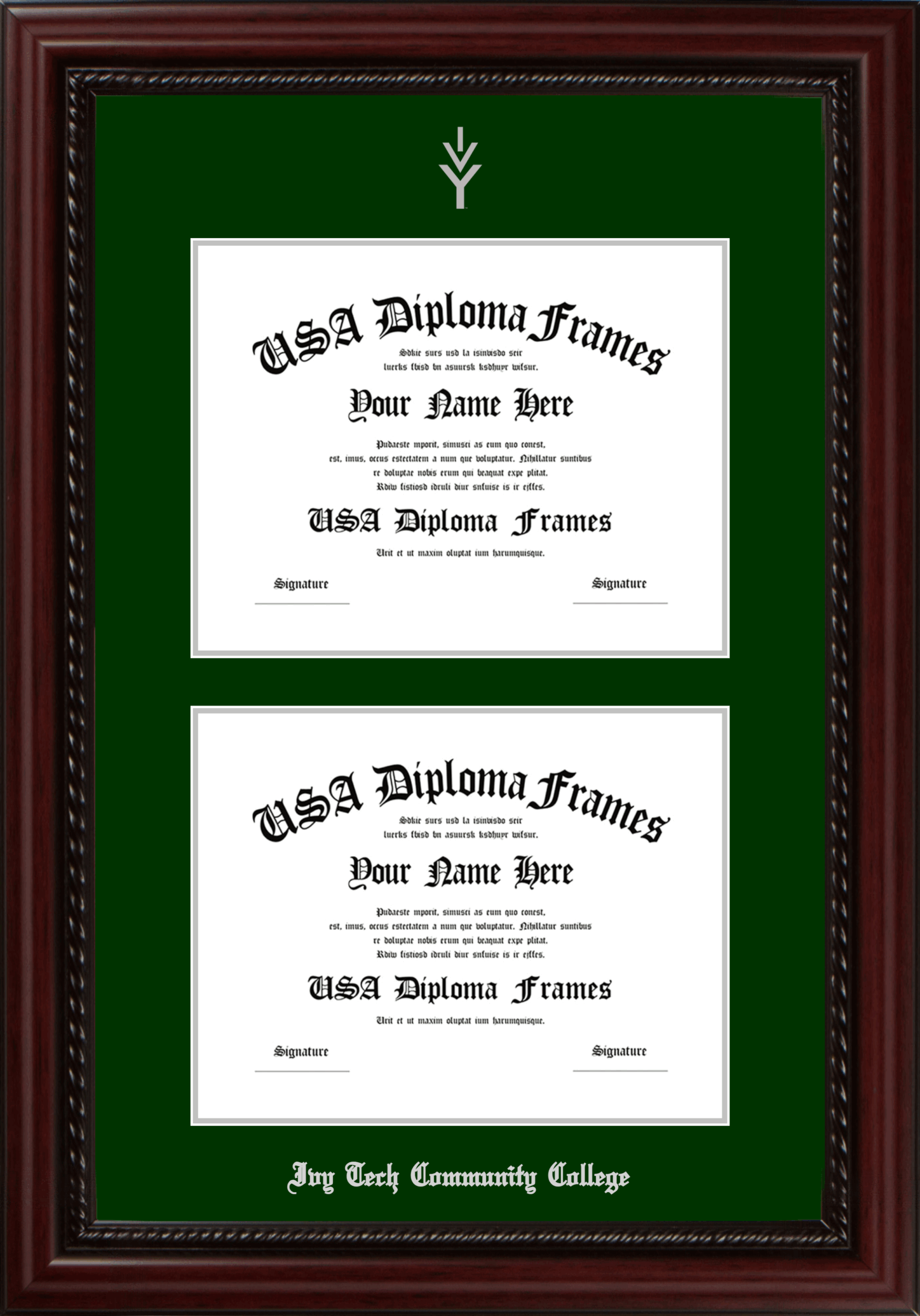 Ivy Tech Community College Double Diploma Frame – Double Document – Executive Cherry Rope – Winter Green and Silver Mat