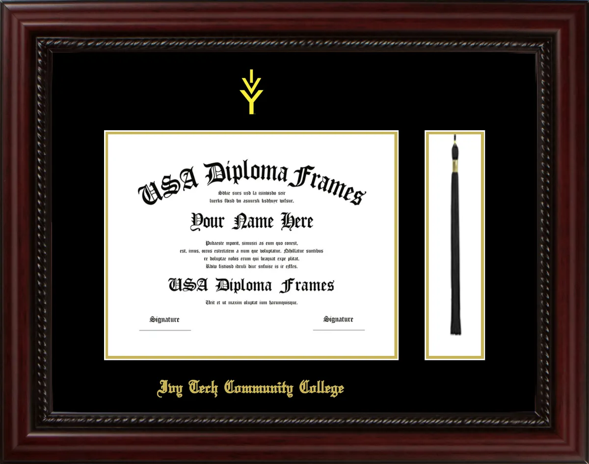 Ivy Tech Community College Diploma Frame with Tassel – Executive Cherry Rope – Black and Gold Mat