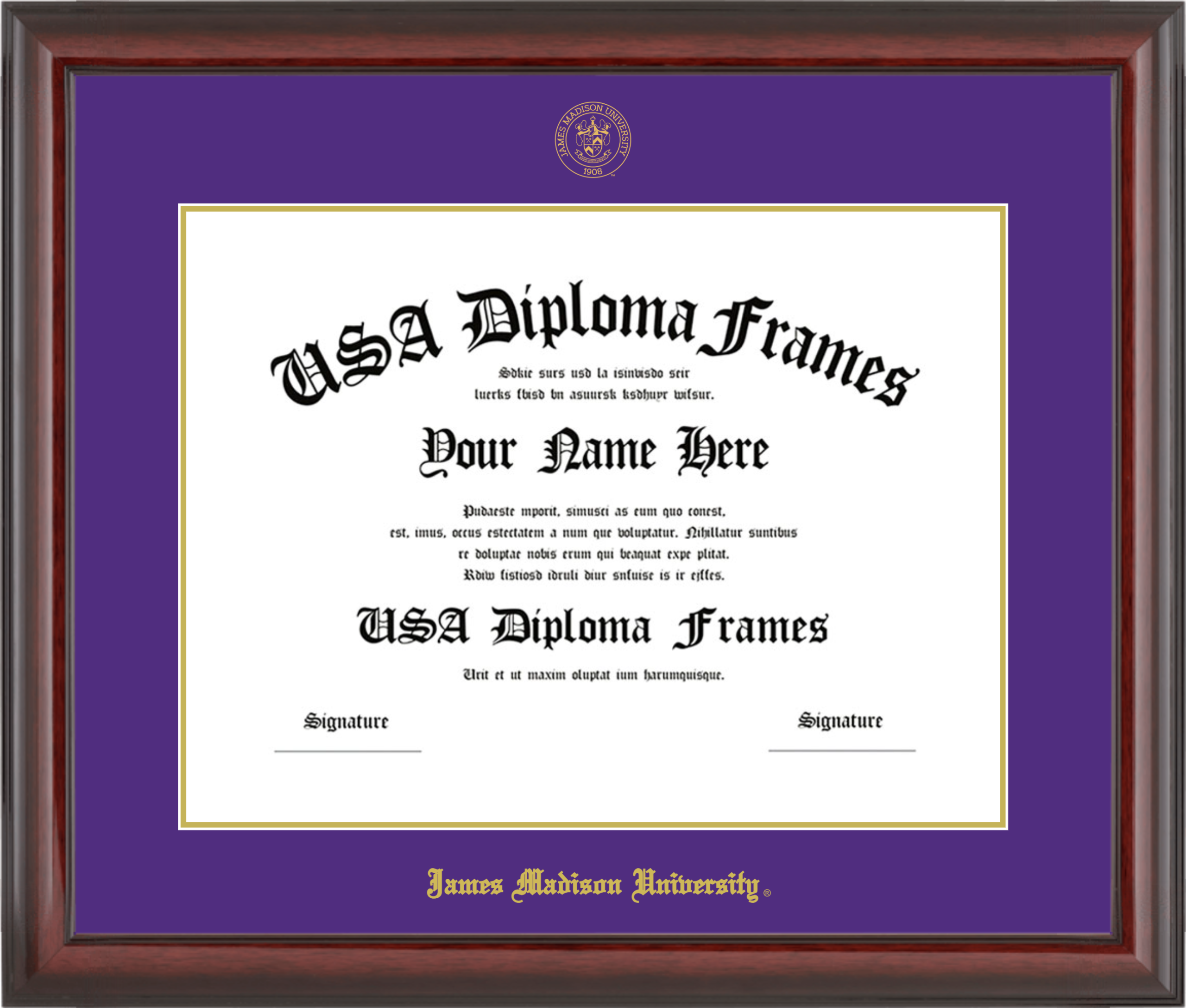 James Madison University – Single Horizontal Document ( Diploma ) – Cherry Mahogany Glossy – Purple Mat – Gold Accent Mat – With Seal(University Seal Gold) – With Gold Embossing (James Madison University)