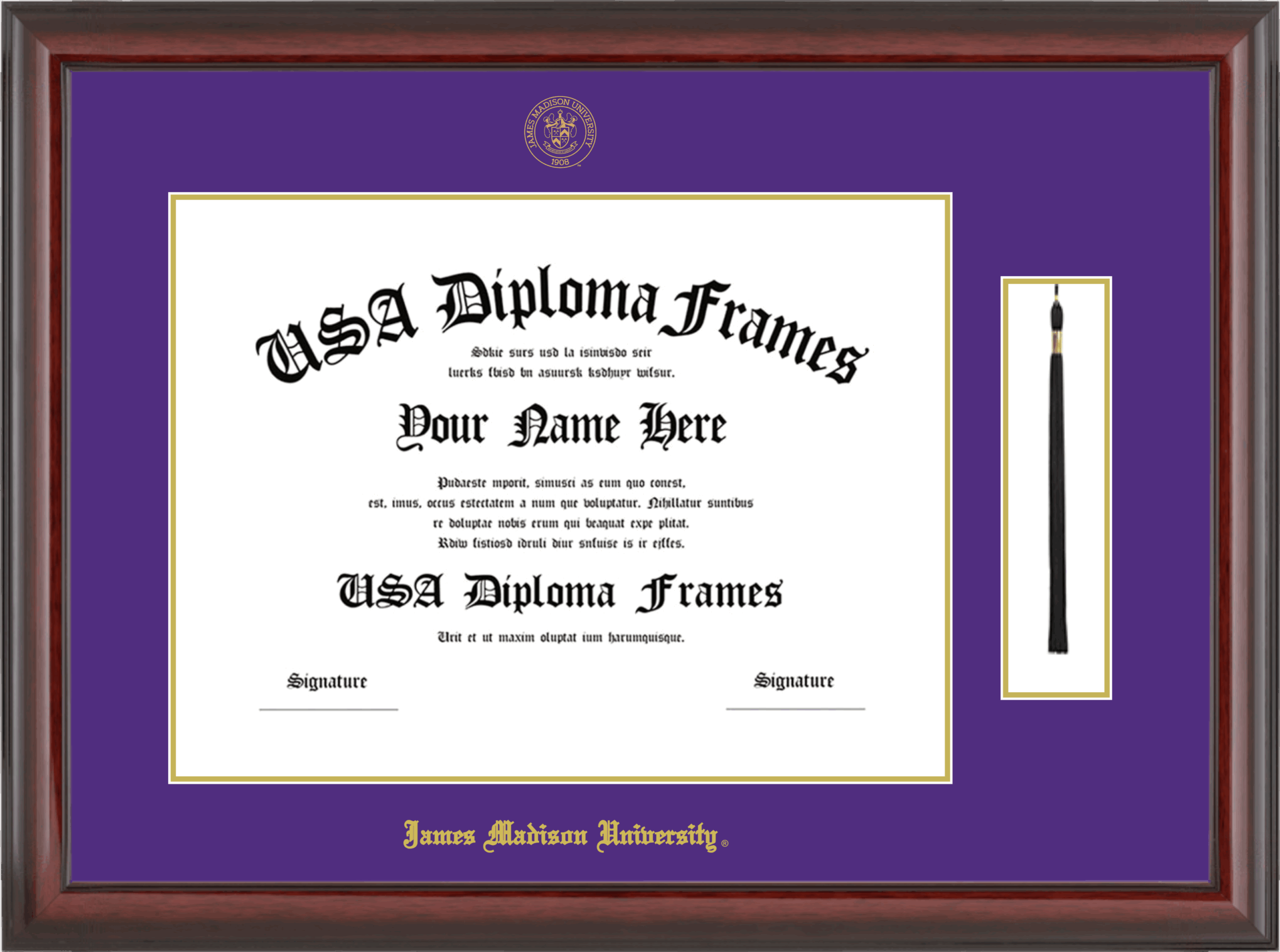 James Madison University Diploma Frame with Tassel – JMU – Cherry Mahogany Glossy – Purple and Gold Mat