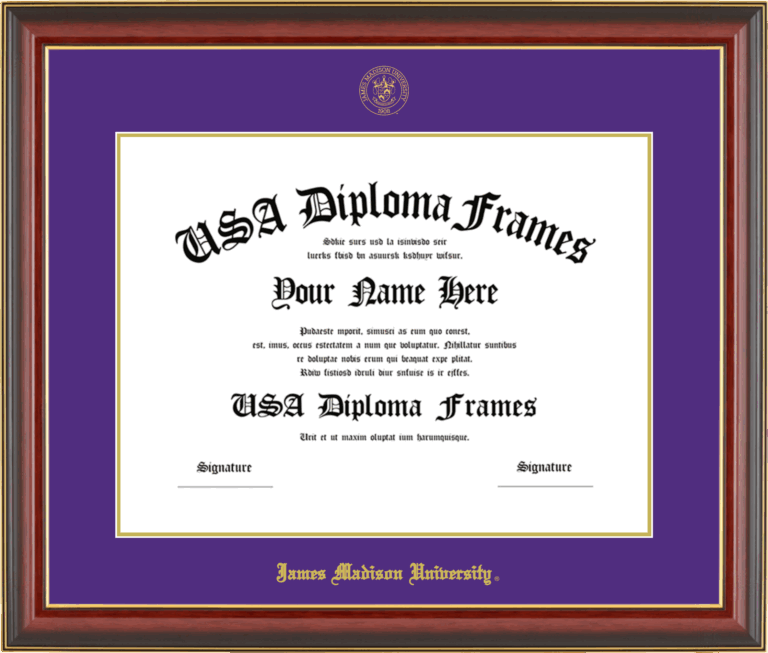 James Madison University Diploma Frame – JMU – Cherry Mahogany Gold Trim Glossy – Purple and Gold Mat