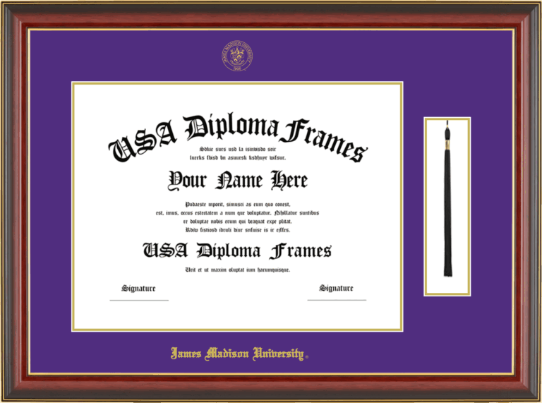James Madison University Diploma Frame with Tassel – Cherry Mahogany Gold Trim Glossy – Purple and Gold Mat