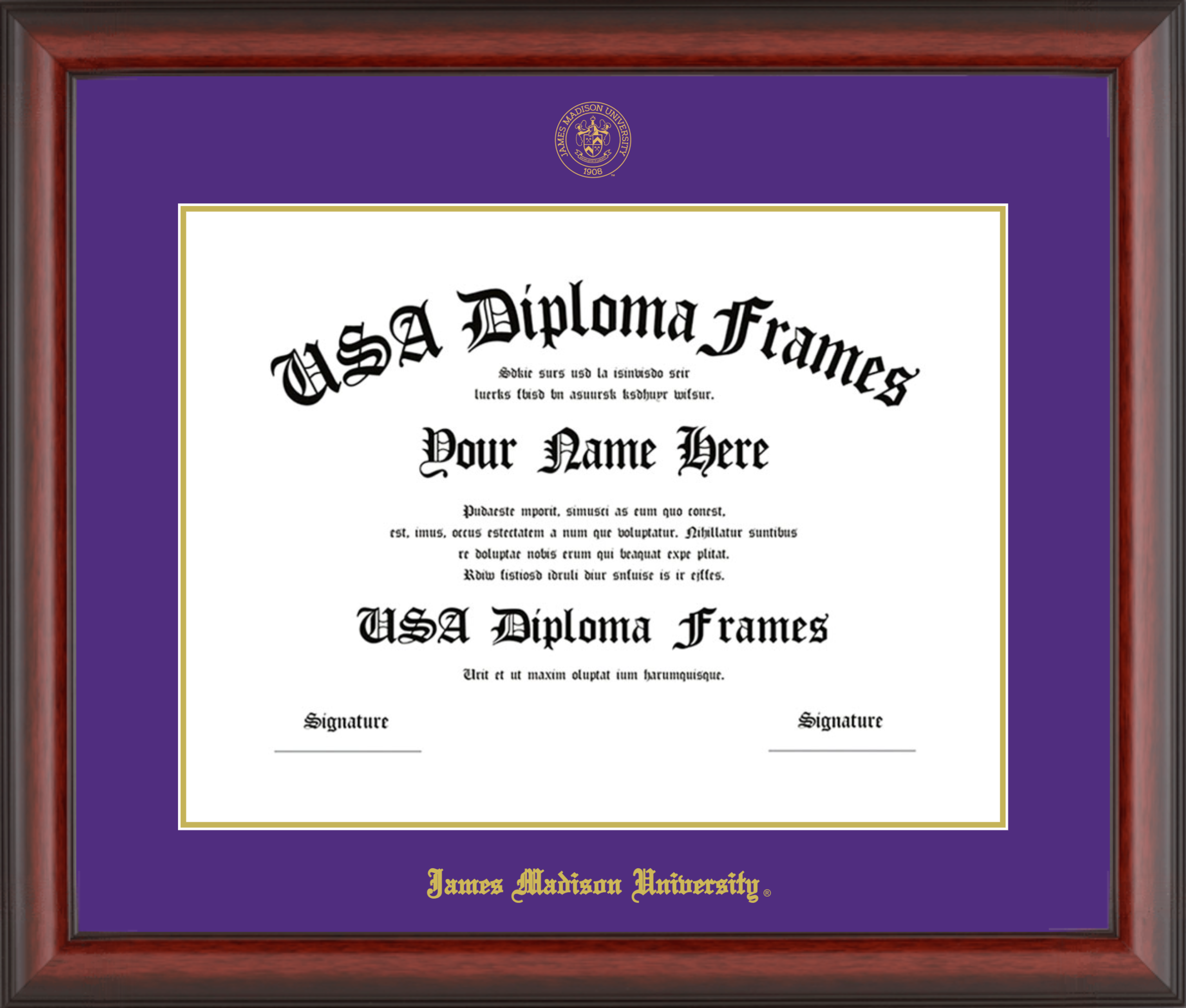 James Madison University – Single Horizontal Document ( Diploma ) – Cherry Mahogany Matte – Purple Mat – Gold Accent Mat – With Seal(University Seal Gold) – With Gold Embossing (James Madison University)