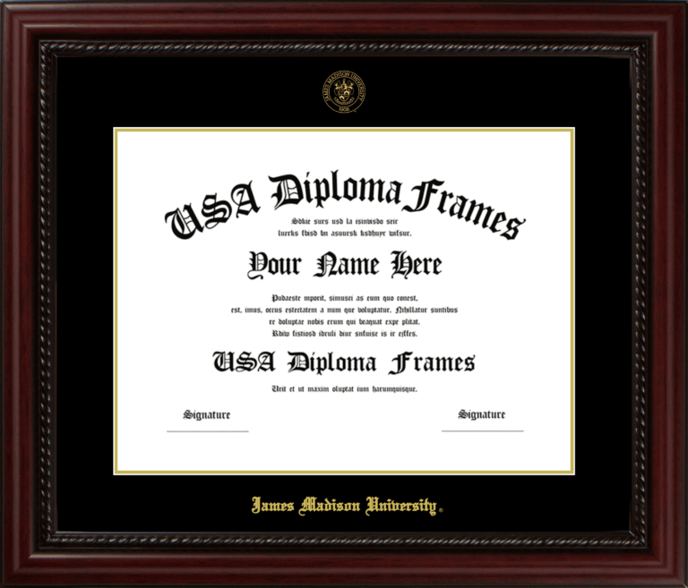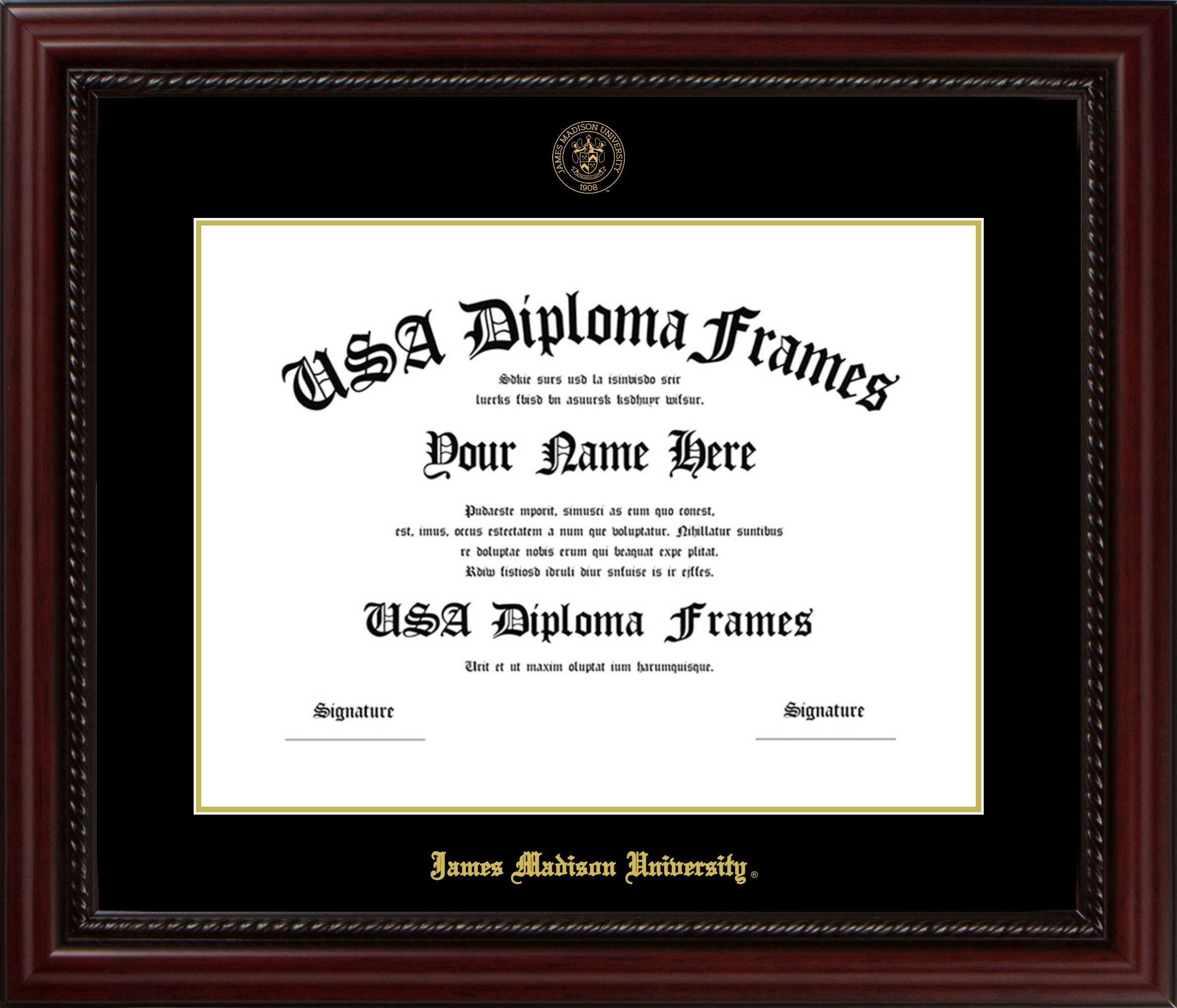 James Madison University Diploma Frame – JMU -Executive Cherry Rope – Black and Gold Mat
