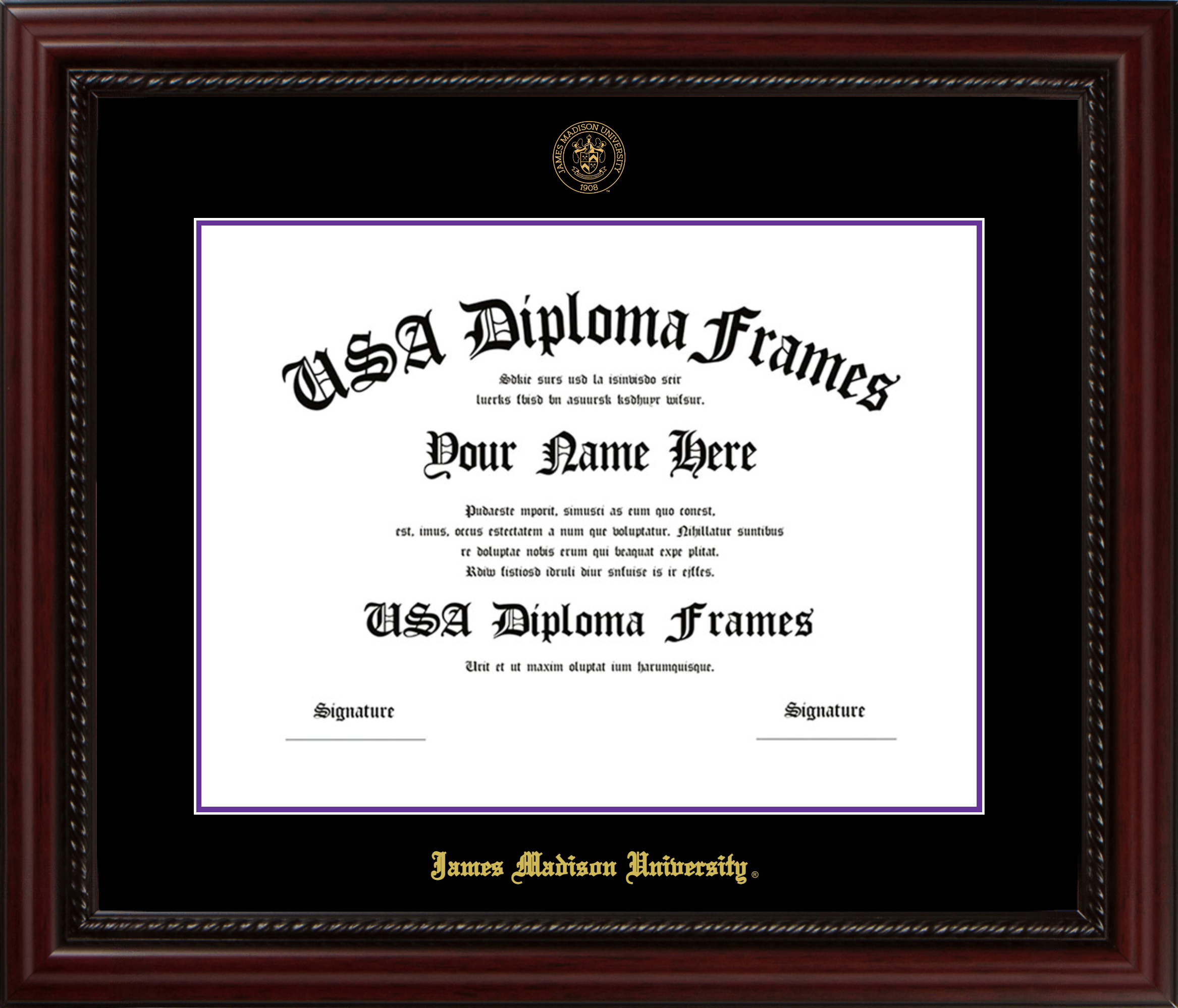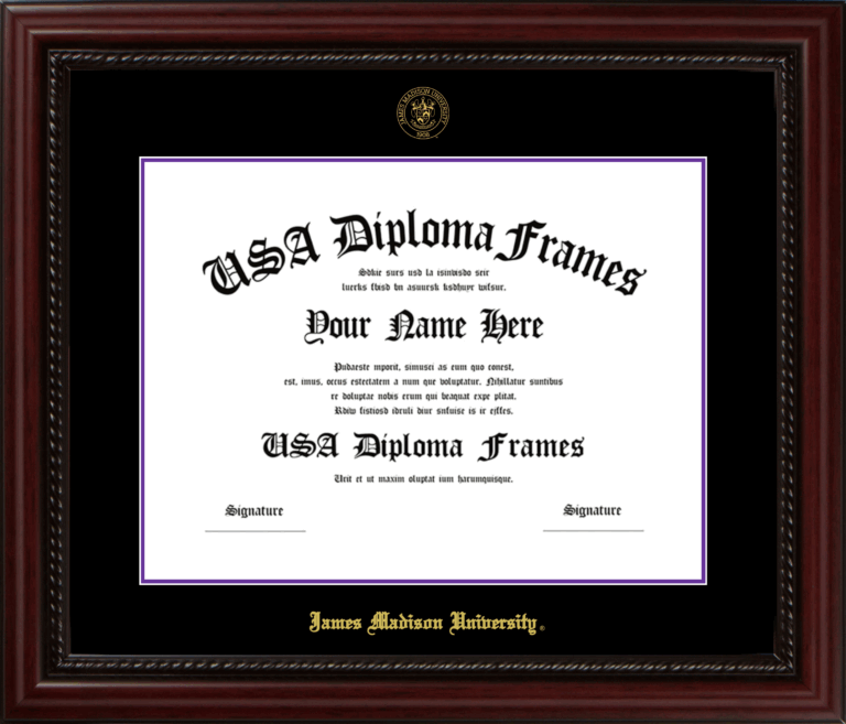 James Madison University Diploma Frame – Executive Cherry Rope – Black and Purple Mat