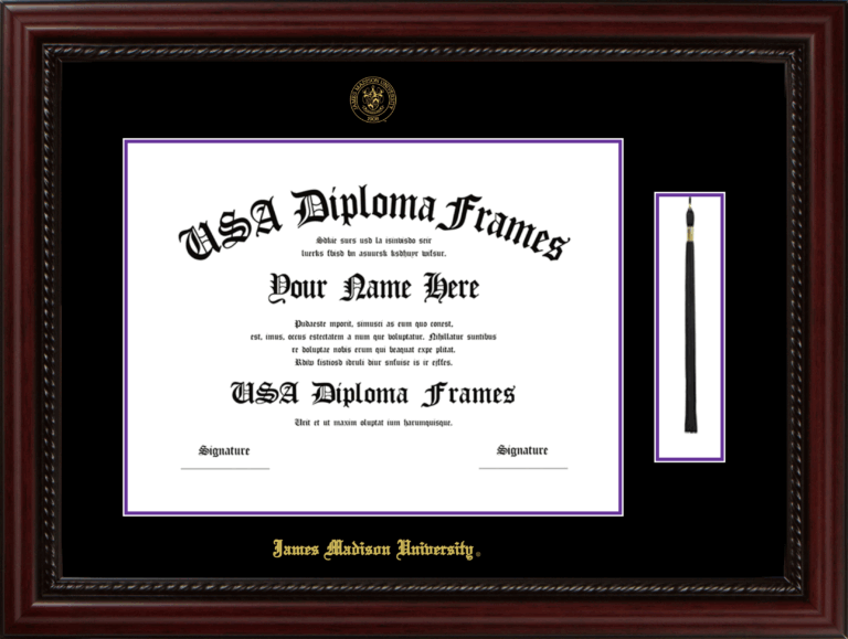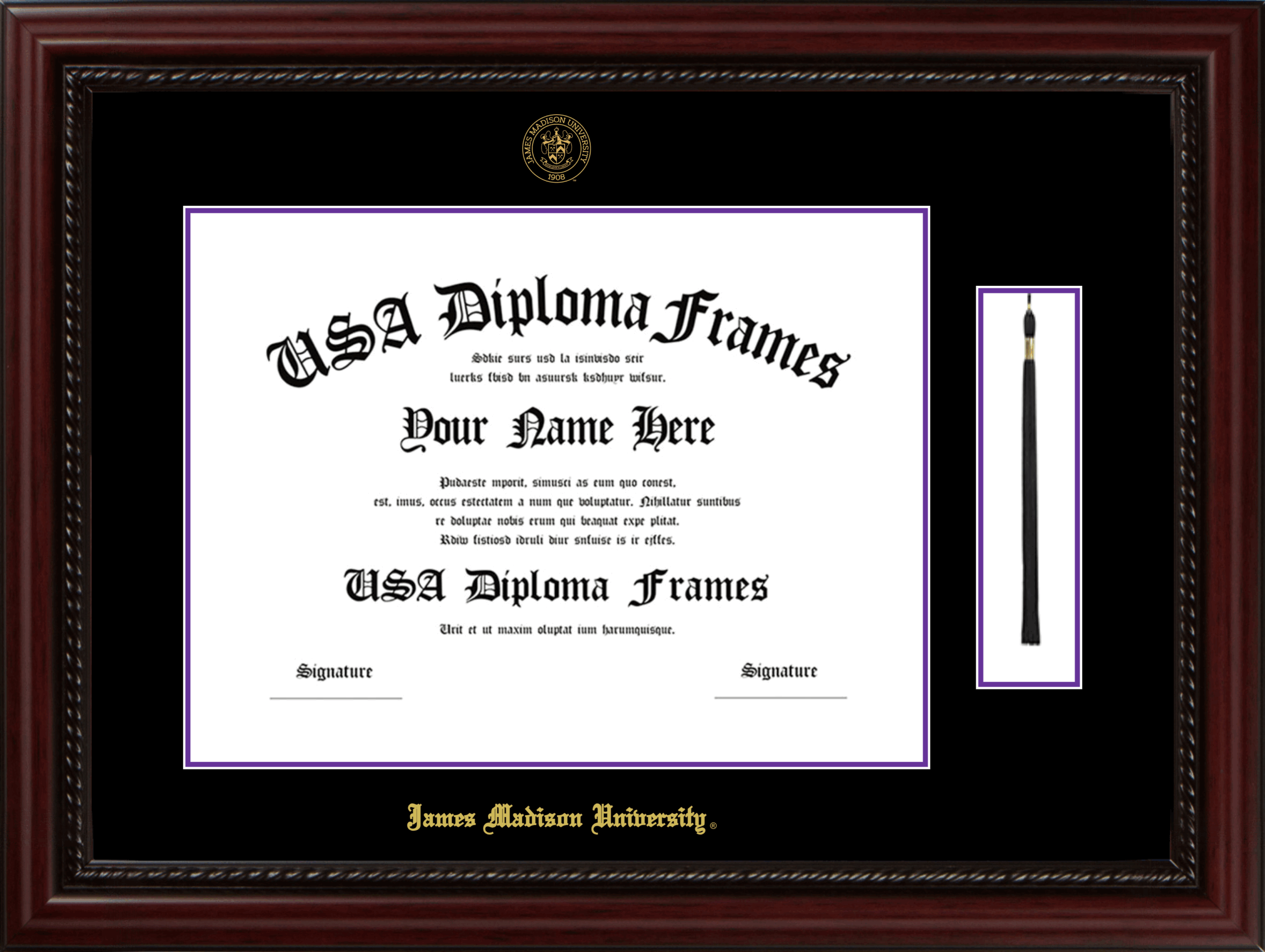James Madison University Diploma Frame with Tassel – JMU – Executive Cherry Rope – Black and Purple Mat