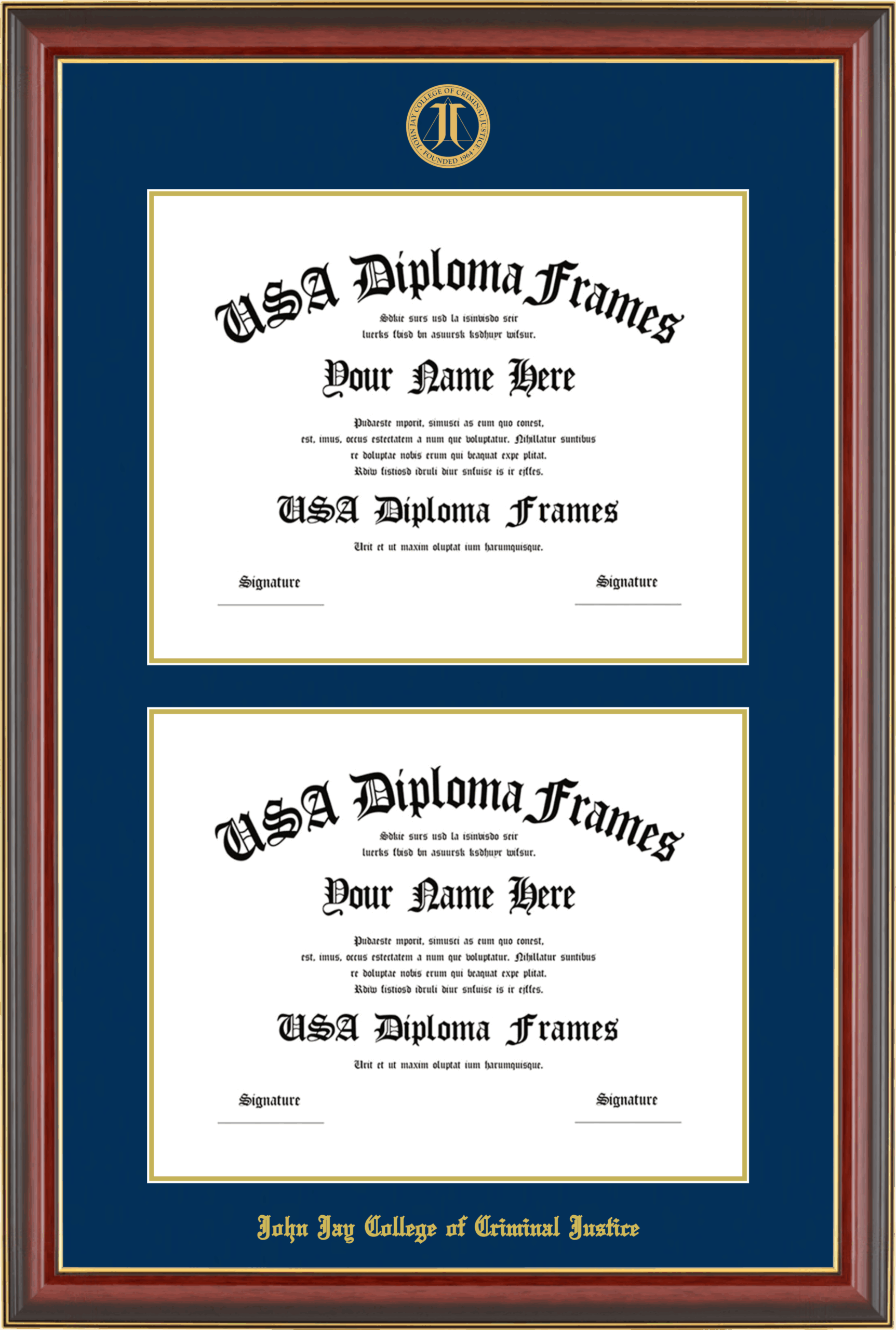 John Jay College of Criminal Justice Double Diploma Frame – Double Document – Cherry Mahogany Gold Trim Glossy – Navy and Gold Mat