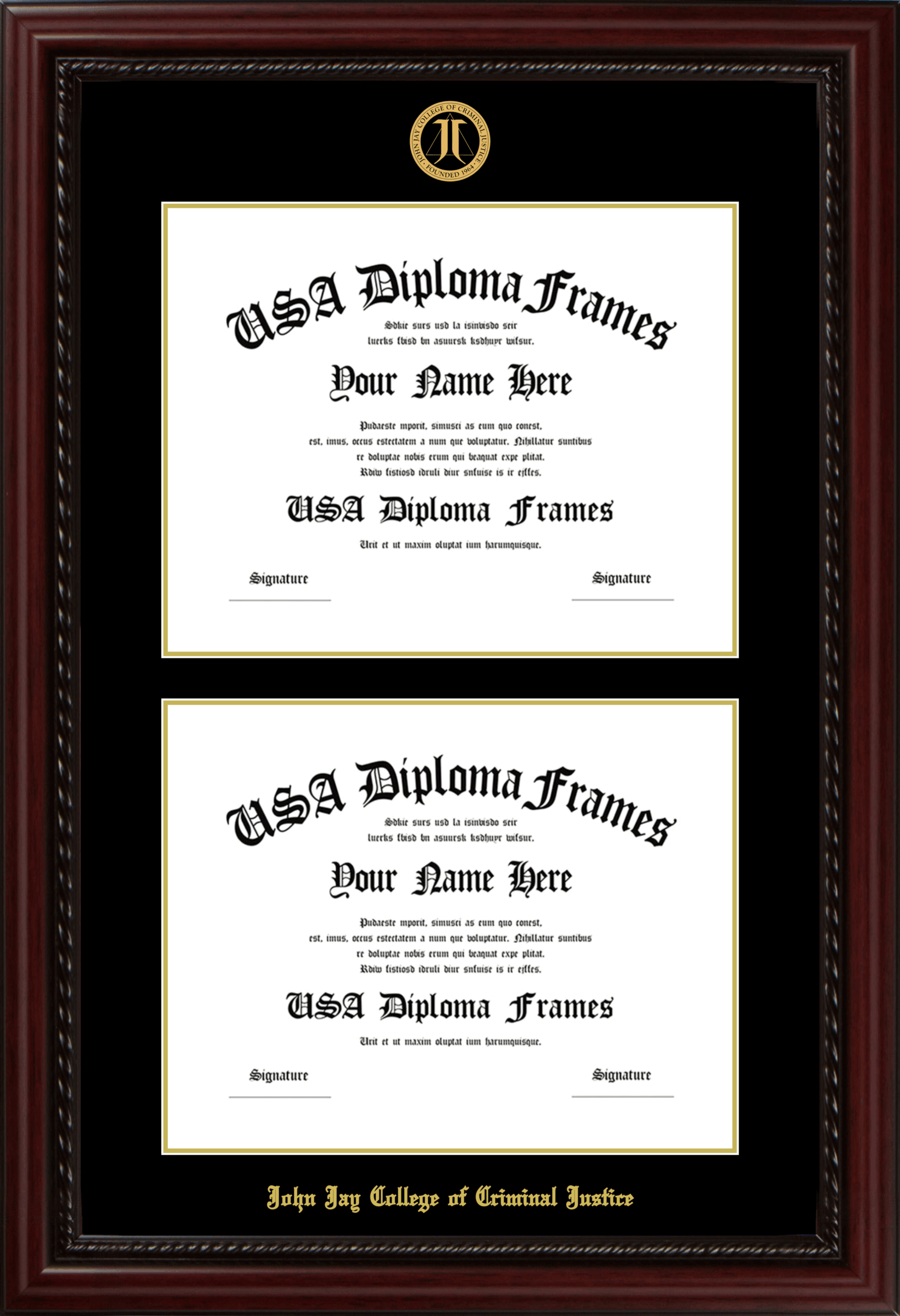 John Jay College of Criminal Justice Double Diploma Frame – Double Document – Executive Cherry Rope – Black and Gold Mat