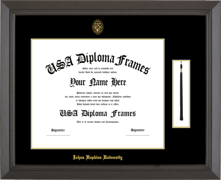 Johns Hopkins University Diploma Frame with Tassel – Black Rope – Black and Gold Mat