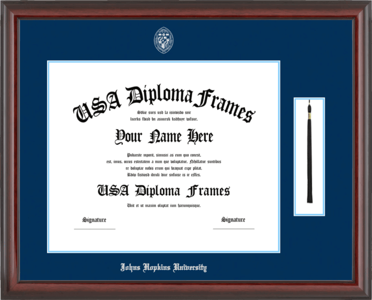 Johns Hopkins University Diploma Frame with Tassel Cherry Mahogany Glossy – Navy and Light Blue Mat – Silver Seal