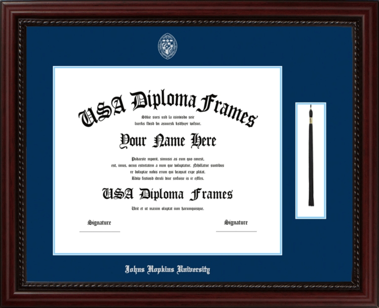 Johns Hopkins University Diploma Frame with Tassel – Executive Cherry Rope – Navy and Light Blue Mat – Silver Seal